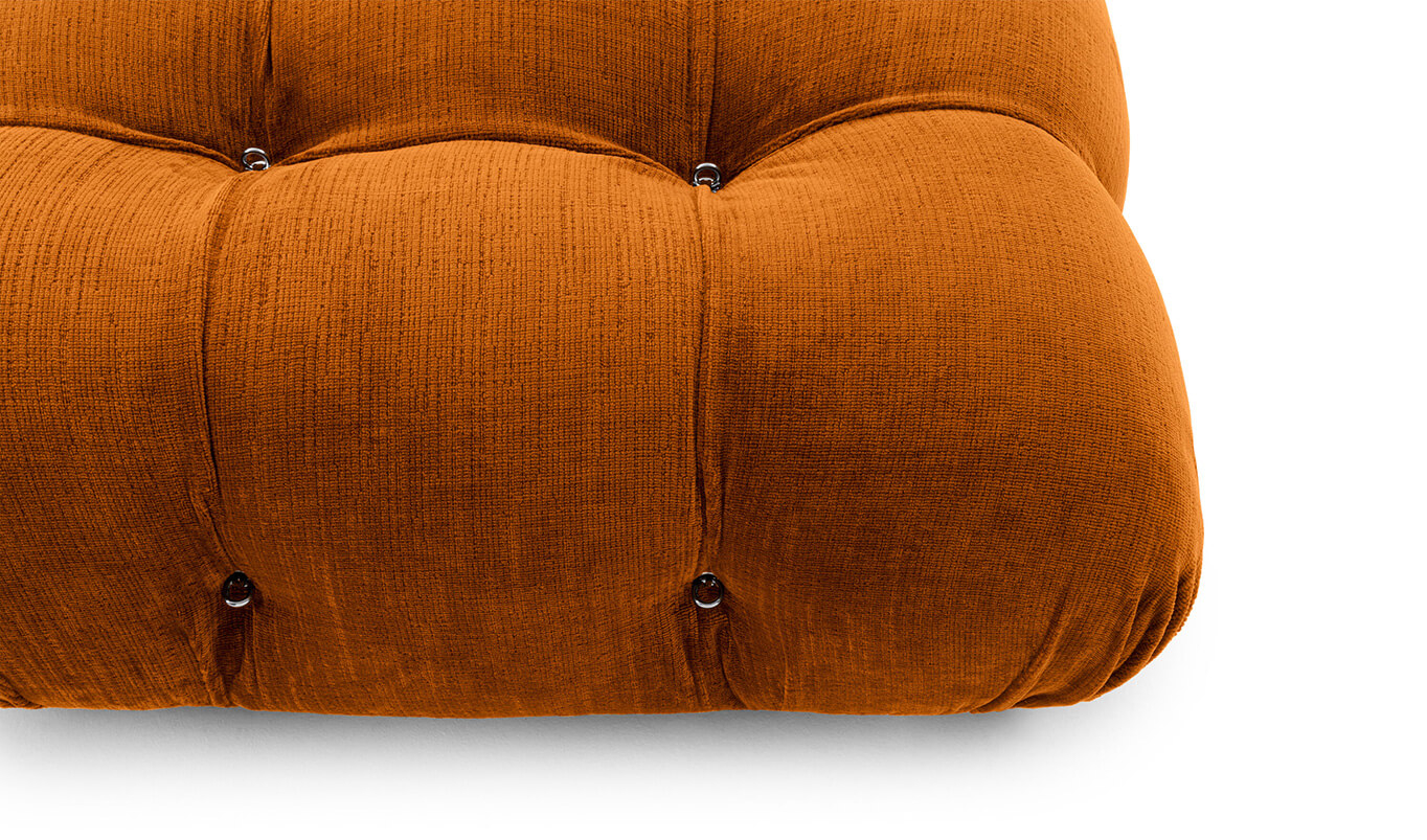 In its reissue, Camaleonda retains the elements that made it a contemporary classic. By mutual agreement, Mario Bellini and the founder of B&B Italia, Pierre Ambrogio Busnelli, chose to keep the 90x90 cm seat module, along with the backrest and armrests, faithful to the original design. The original templates for cutting the upholstery were also recovered. The generous polyurethane padding, which forms the characteristic tufting, remains unchanged. It is achieved through Bellini’s innovative system of cables, hooks, and rings designed in 1970, ensuring the sofa’s appearance and modularity. Thanks to these cables and rings, the modules can be detached and recomposed at will, allowing the sofa to adapt to the evolving tastes and dynamic needs of its users. Architect and designer Mario Bellini has a particular view on his creation: “Among all the objects I’ve designed, Camaleonda is undoubtedly the one that best represents the concept of freedom. The configurations that can be achieved are infinite.” The Camaleonda sofa was produced from 1970 to 1979. In its nine years of existence, this modular sofa became an undeniable reference in Italian design. It is no surprise that fifty years later, B&B Italia has brought Camaleonda back into the spotlight by re-launching its production. The reissue project was initiated in 2019. It took nearly a year to adapt the sofa to current challenges. The materials used in this sofa are recycled and recyclable. The structure of Camaleonda is made of wood panels, and the spherical feet are crafted from Forest Stewardship Council certified beech wood. Its removable cover, made from dacron (a synthetic fabric entirely made from recycled PET), protects the padding. The seat of Camaleonda required significant work from the research and development teams at B&B Italia to ensure the various layers interact with each other and create empty spaces to produce a soft spring-like effect. The Camaleonda is a dynamic, lively, and sincere object, also modifiable at will while always maintaining its particular and unique identity. A founding feature of Camaleonda is its practically infinite modularity, a geometric nature that allows each element to become a sort of giant pixel through which one can define their own domestic environment. By attaching and detaching the seats, backrests, and armrests, you have the luxury of changing your mind as many times as you want, shifting and redesigning the space. Camaleonda presents a magical balance between the rigorous geometry of the square and the welcoming roundness of the padding, further highlighting the elasticity and tactile ergonomics that characterize many of Mario Bellini's design projects. Camaleonda can be upholstered in the full range of fabrics and leathers from B&B Italia, allowing for even more possible combinations.