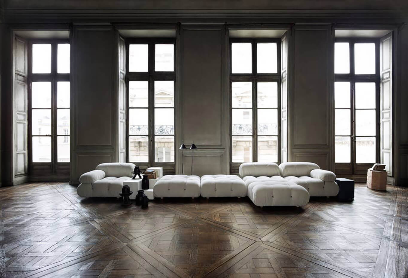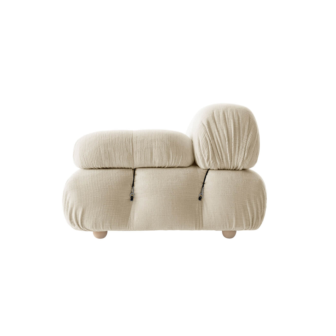 In its reissue, Camaleonda retains the elements that made it a contemporary classic. By mutual agreement, Mario Bellini and the founder of B&B Italia, Pierre Ambrogio Busnelli, chose to keep the 90x90 cm seat module, along with the backrest and armrests, faithful to the original design. The original templates for cutting the upholstery were also recovered. The generous polyurethane padding, which forms the characteristic tufting, remains unchanged. It is achieved through Bellini’s innovative system of cables, hooks, and rings designed in 1970, ensuring the sofa’s appearance and modularity. Thanks to these cables and rings, the modules can be detached and recomposed at will, allowing the sofa to adapt to the evolving tastes and dynamic needs of its users. Architect and designer Mario Bellini has a particular view on his creation: “Among all the objects I’ve designed, Camaleonda is undoubtedly the one that best represents the concept of freedom. The configurations that can be achieved are infinite.” The Camaleonda sofa was produced from 1970 to 1979. In its nine years of existence, this modular sofa became an undeniable reference in Italian design. It is no surprise that fifty years later, B&B Italia has brought Camaleonda back into the spotlight by re-launching its production. The reissue project was initiated in 2019. It took nearly a year to adapt the sofa to current challenges. The materials used in this sofa are recycled and recyclable. The structure of Camaleonda is made of wood panels, and the spherical feet are crafted from Forest Stewardship Council certified beech wood. Its removable cover, made from dacron (a synthetic fabric entirely made from recycled PET), protects the padding. The seat of Camaleonda required significant work from the research and development teams at B&B Italia to ensure the various layers interact with each other and create empty spaces to produce a soft spring-like effect. The Camaleonda is a dynamic, lively, and sincere object, also modifiable at will while always maintaining its particular and unique identity. A founding feature of Camaleonda is its practically infinite modularity, a geometric nature that allows each element to become a sort of giant pixel through which one can define their own domestic environment. By attaching and detaching the seats, backrests, and armrests, you have the luxury of changing your mind as many times as you want, shifting and redesigning the space. Camaleonda presents a magical balance between the rigorous geometry of the square and the welcoming roundness of the padding, further highlighting the elasticity and tactile ergonomics that characterize many of Mario Bellini's design projects. Camaleonda can be upholstered in the full range of fabrics and leathers from B&B Italia, allowing for even more possible combinations.