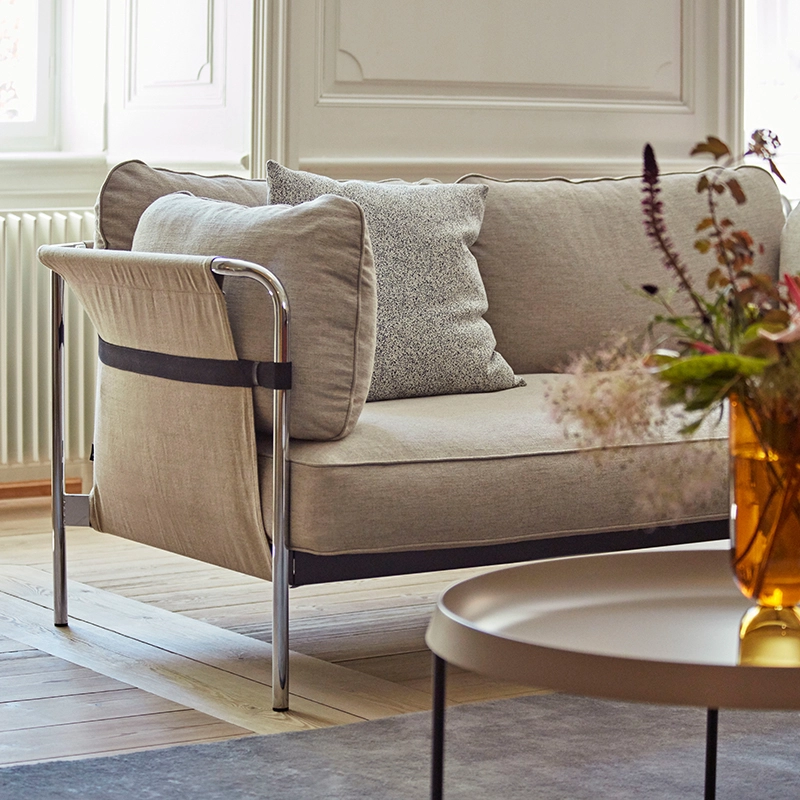 The Can collection was born of designers Ronan and Erwan Bouroullec's desire to go beyond creating a simple piece of comfortable, aesthetically pleasing furniture. With this series published by Hay, their intention is to completely reinvigorate the idea we have of the sofa, and move from a complicated piece of furniture to a simple, accessible piece. The Can series includes two sizes of sofa and an armchair, each delivered flat-packed. The piece of furniture is easily assembled at home from three elements: a light yet sturdy metal frame, panels of fabric that stretch over the structure, and thick cushions. The result is a piece of furniture that stands out from other seating with its visual lightness and its welcoming, enveloping lines, perfect for a cosy living room.