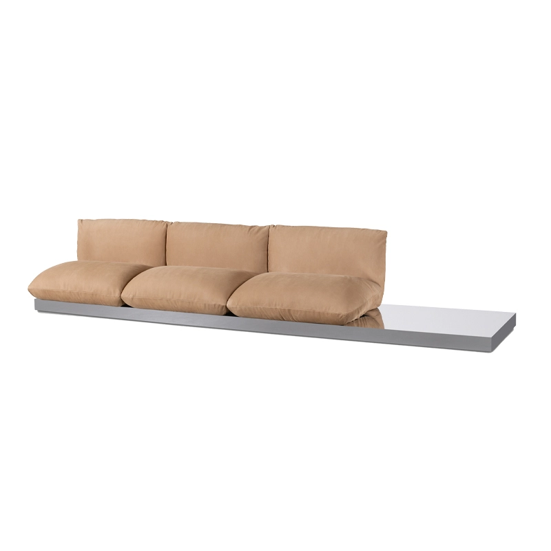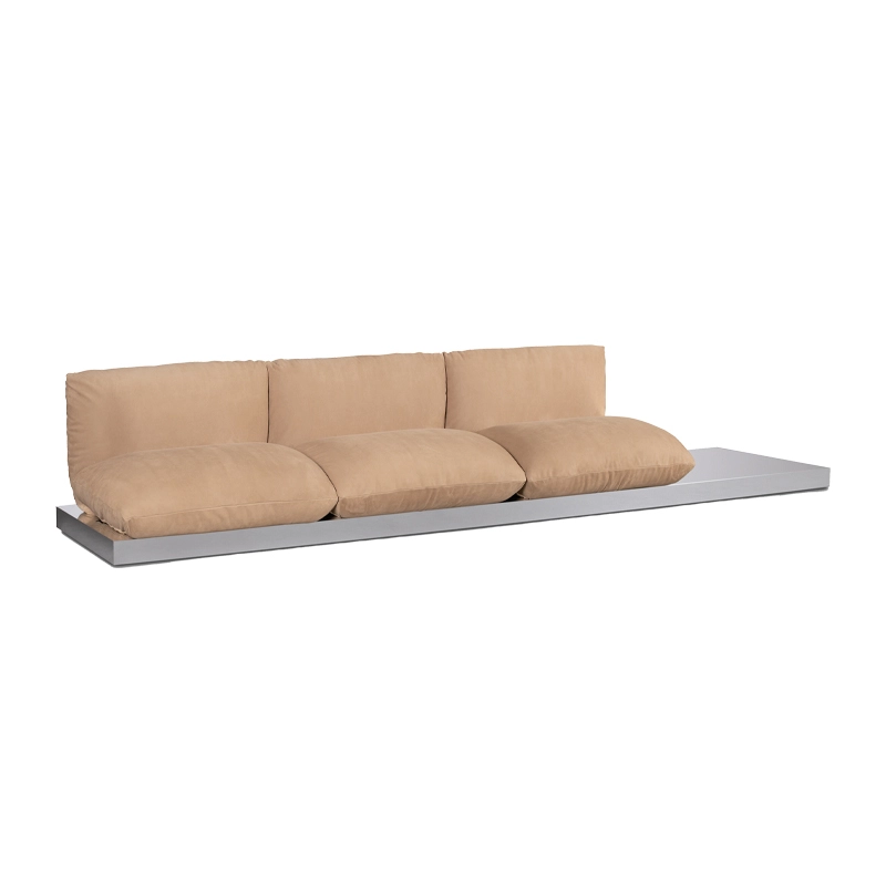 From Hannes Peer's visionary inspiration came Aura, edited by Baxter, the leather modular sofa with a design instantly recognisable for its essential elegance, echoing the luminous glamour of Californian villas. The extra-large seat and back cushions rest on a solid, slightly raised base that also acts as a support surface. These are modular elements that allow you to create ever-new user-friendly configurations and customise the scenario to suit your needs. The strong design of Aura's structure, available in polished and rhubarb lacquered steel, perfectly balances the curved lines of the modular modules, offering maximum comfort both in moments of conversation and relaxation.