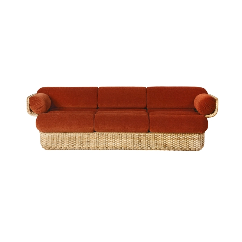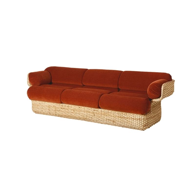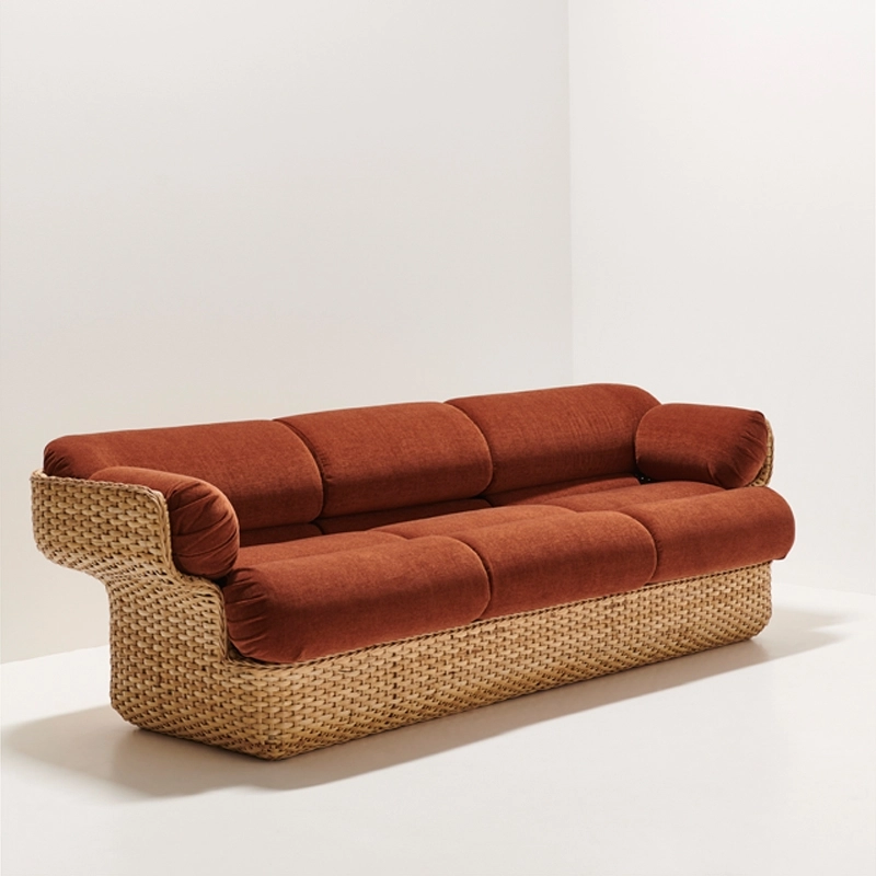 The Basket collection from Gubi pays homage to the classic rattan basketry technique. The collection includes a three-seater sofa, a two-seater sofa and an armchair, all sharing the same construction and features.  Replacing the fibreglass inner shell Colombo originally used, the Basket sofa is now formed from a more environmentally-friendly steel skeleton, which lends strength and stability to the unique shape. The structure is covered in hand-woven rattan, using a technique that requires an enormous degree of skill and craftsmanship to create. The Basket sofa features rounded cushions on the seat and back, made from comfortable foam with cylindrical cushions adding extra softness and a wrap-around effect to the sides of the seat.