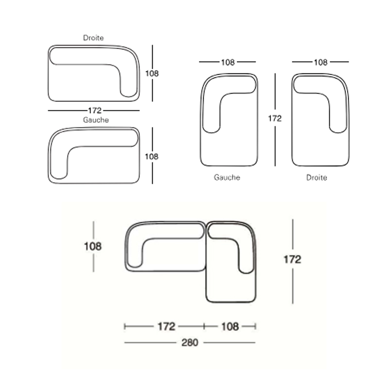 l 280 x p 172 x h 71 cm, assise h 41 cm