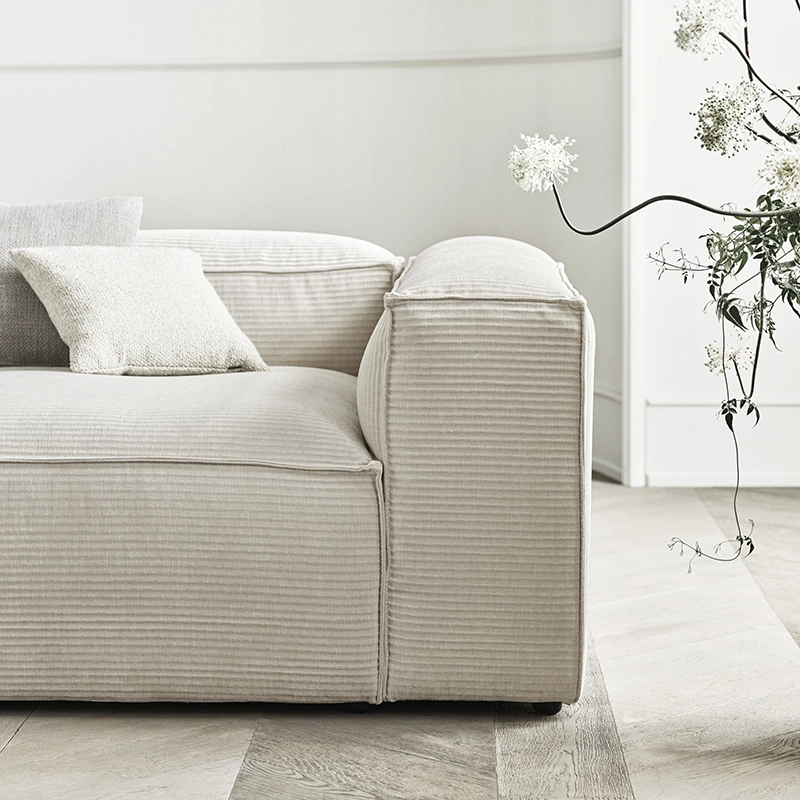To maintain the sofa, it is important to flap the cushions to give the sofa volume on a regular basis, but it is not possible to maintain a fixed shape. Cosima will take on a more rounded shape over time and the look of the seams will become more organic thanks to the soft, comfortable padding. This should not be seen as a defect, but as a normal patina that softens the appearance of the sofa.
