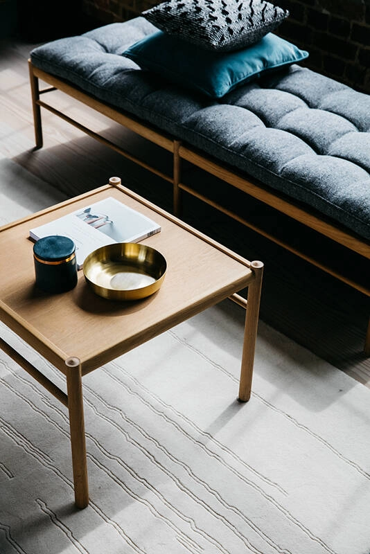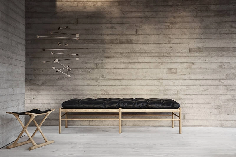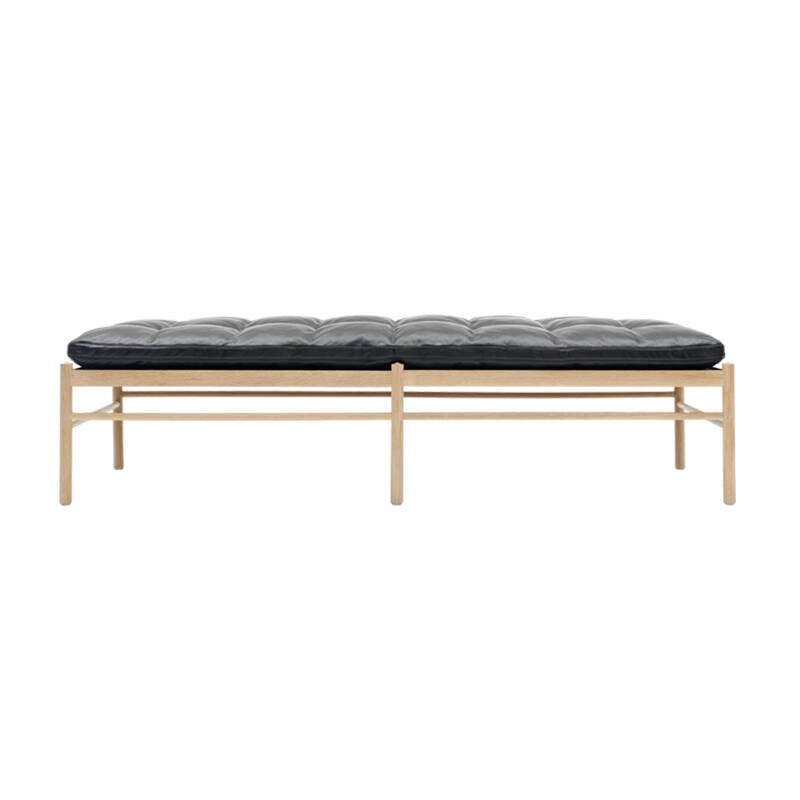 The sleek and classic OW150 daybed, designed by Ole Wanscher in 1963 for Carl Hansen, features a single long cushion that appears to float above an angular solid oak frame. It is supported by a delicate but solid cotton strap. The hand-sewn buttons create a simple square pattern that enhances the geometric shape of the bench seat. The OW150 daybed clearly shows how intrigued and inspired Wanscher was by classic furniture design. He studied it wherever he went, incorporating the styles and elements that he felt best fused functionality and aesthetics into his own work. His modern classics are still iconic for their detail and deep respect for materials.