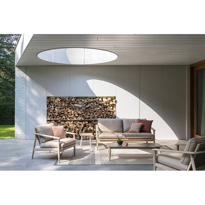 teck teinté brossé, corde en polypropylène greige, coussins mousse quick dry, fibre de polyester, tissu savane coconut s2222, passepoil london stone s0808