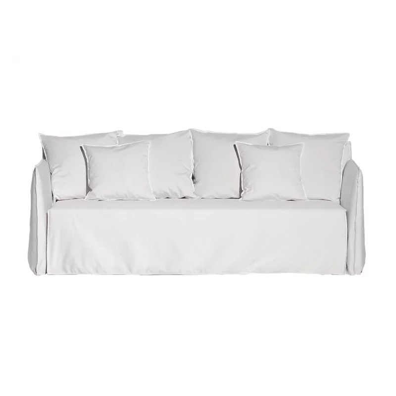 The Ghost Out 12 upholstered sofais designed by Paola Navone for the Gervasoni brand. The sofa is based on a lightweight shell with essential volumes. Designed to withstand water and sun and retain its shape and aesthetics over time, it features a geometric structure where loose cushions add an extra degree of comfort. Comfortable and enveloping, the Ghost Out 12 sofa has removable covers. The main feature of the Ghost Out 12 sofa is its cover: an oversized slipcover emphasised by visible stitching. The Ghost Out 12 sofa cover is easy to remove, so you can give it a different look every time.