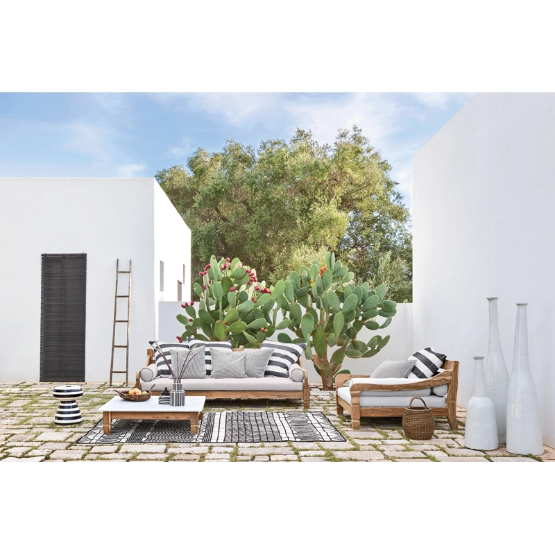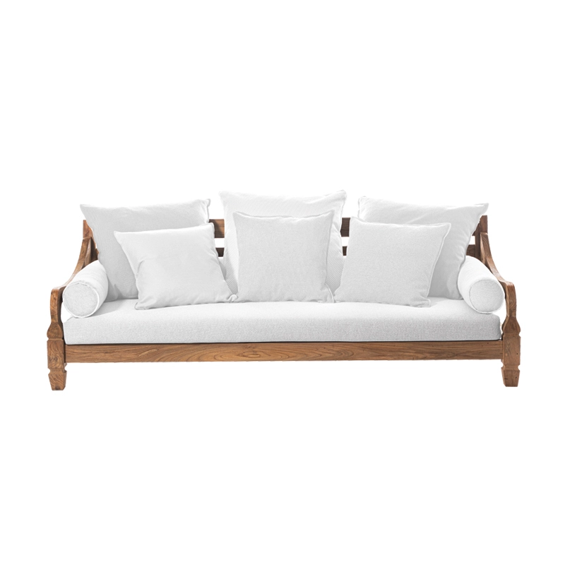 The Jeko 04 sofa was designed by Paola Navone for the Gervasoni brand. Colonial in style and exotic in inspiration, the Jeko 04 sofa has an eco-teak structure. Designed to withstand water and sun, this material is made from reclaimed teak beams and elements, which are repaired with recycled wood, assembled and then polished to bring out the wood's original grain. Jeko 04 has a wide, low seat with removable seat and back cushions, designed for outdoor use.