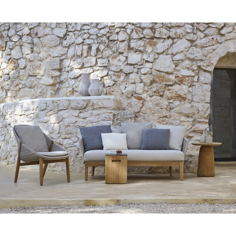 The airy design of the Mood collection, and the combination of warm teak with the skilful hand-weaving of the backrests immediately create an intimate atmosphere on your terrace. The silhouette of the durable teak base gives the collection a soft, welcoming look. The weave of the Mood 2-seater sofa is handmade from Tricord, an eco-friendly fibre (polyolefin) that is very soft to the touch and weather-resistant. Tribu has created the Mood collection in a range of natural shades that allow it to blend into any outdoor environment. The comfort of this Mood sofa is enhanced by thick, plush outdoor cushions, designed for staying outdoors all season long.