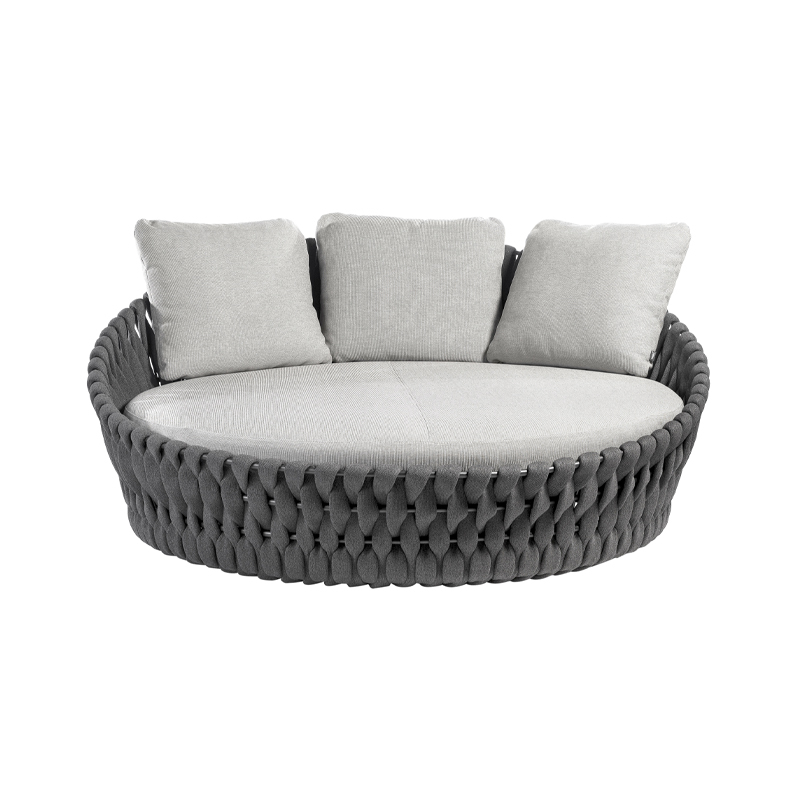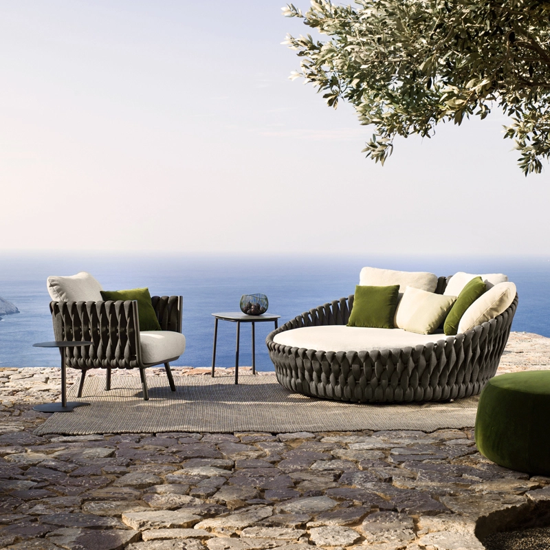 The Tosca outdoor furniture collection from Tribu is both welcoming and warm, chic and intriguing. This is the first time that Tribu has called on Monica Armani, who designed this luxurious collection charged with emotion and femininity, combining extra-wide vertical braided seats supported by slightly converging tapered legs. The materials used to create the Daybed Tosca backrest weave are undoubtedly innovative: foam covered with a knitted sheath that is not only weather-resistant, but also extremely soft to the touch with a totally natural look. The Daybed Tosca, with its ultra-generous shapes, is the ideal setting for lounging and dreaming in the sun. The seat is very soft, thanks to the comfortable cushions with padding specifically designed for outdoor use.