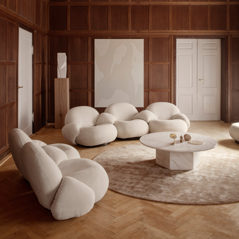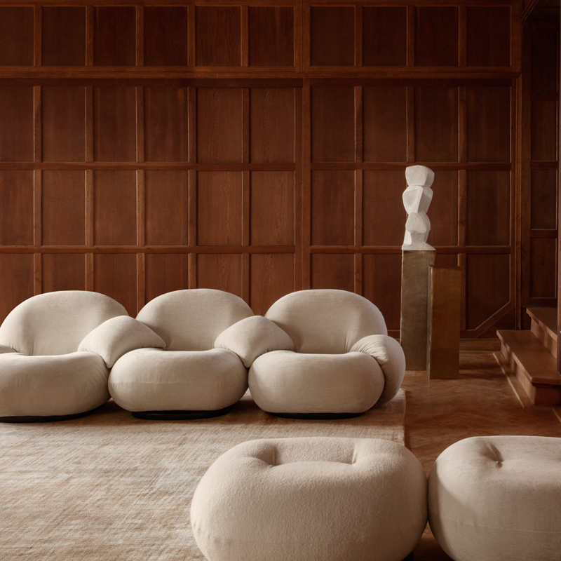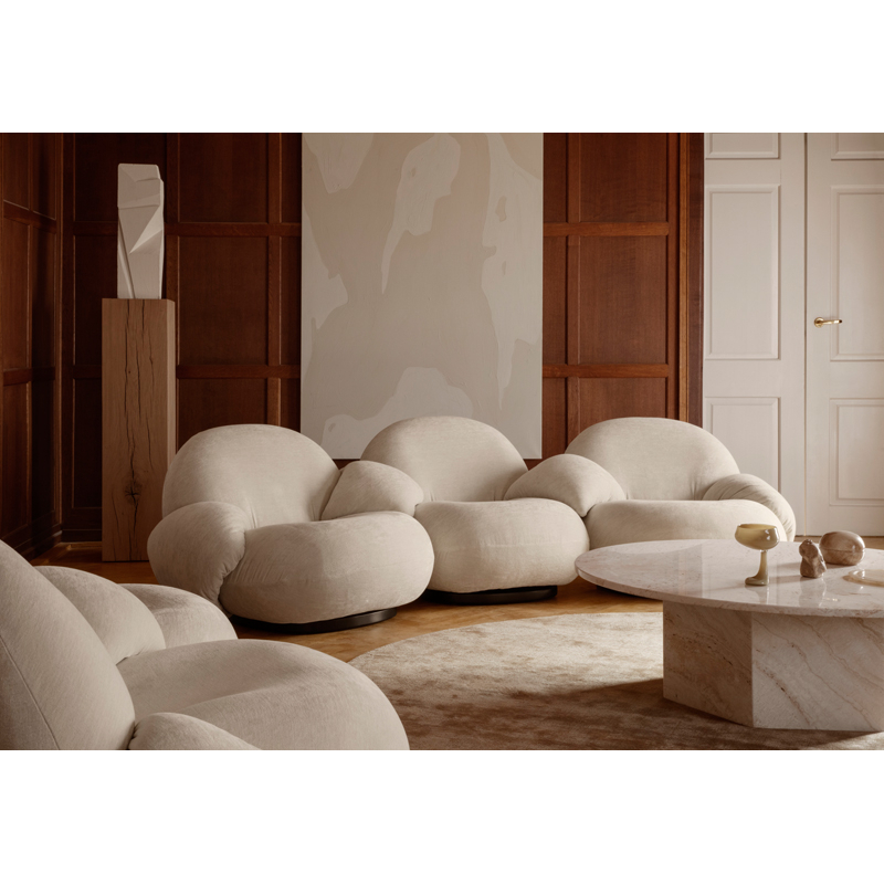 Reissued today by Gubi, the Pacha collection was originally designed by Pierre Paulin in 1975. The French designer imagined a new design form, replacing post-war austerity with a new, much more vigorous approach. Pierre Paulin has succeeded in giving real elegance to the rounded shapes of the Pacha armchair by finding the perfect proportions. The seat is slightly raised at the base and the seams emphasise the shape. Pierre Paulin was also one of the first to get rid of armchair legs and in doing so establish a new way of life, sitting closer to the ground. The result is a modern and durable armchair that offers comfort and warmth. Now available in sofa version, Pacha is a unique series that brings life and character to all interior styles.