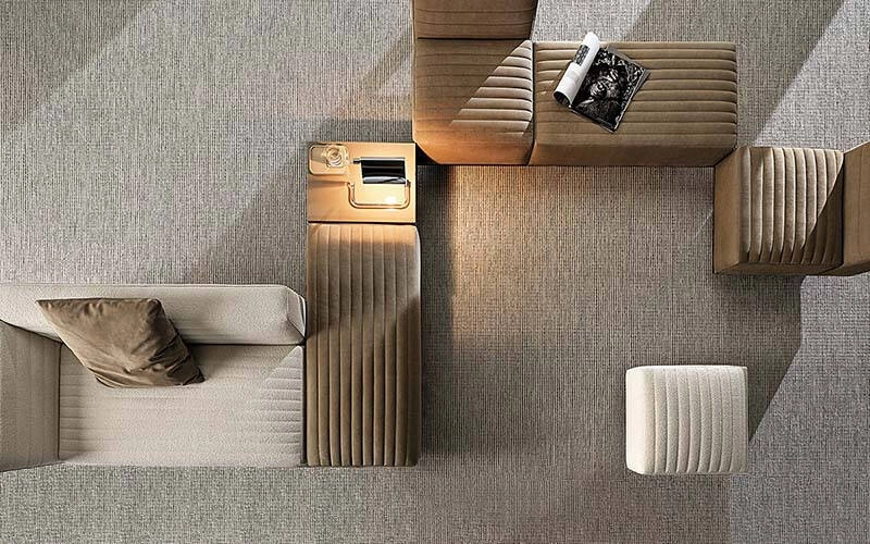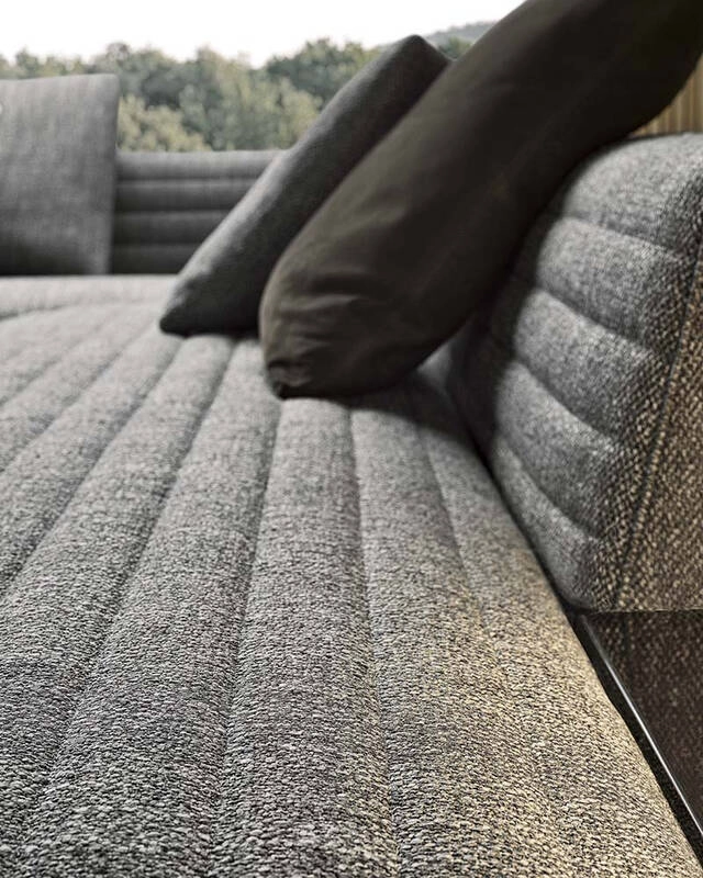 The Roger sofa features two Black Coffee painted aluminium cross slats making the fulcrum virtually disappear while raising it 13cm above the floor, giving the seats an airy feel. A guarantee of the prestige and softness of the surfaces, Minotti's couture expertise can be seen in the graphic upholstery drawing long horizontal lines throughout the backrests, fixed seat elements and bench seats completing Roger.