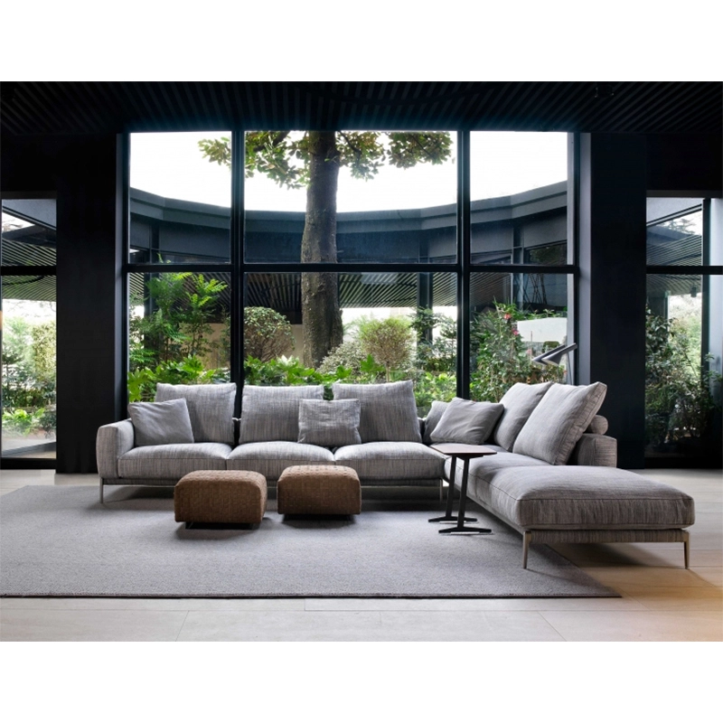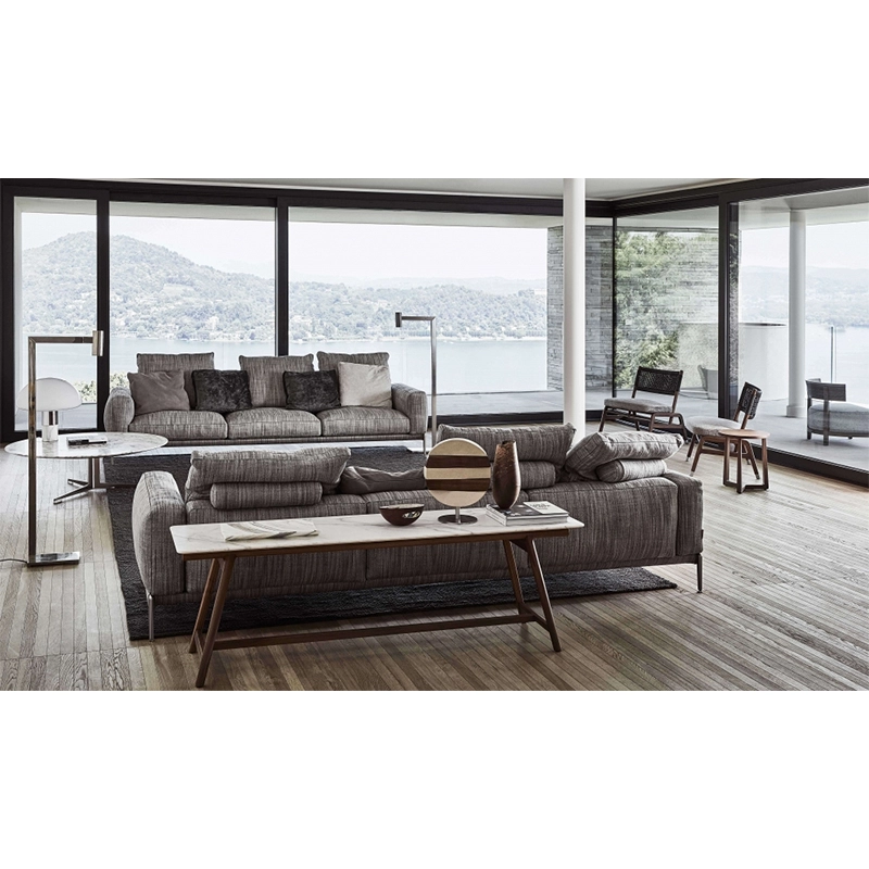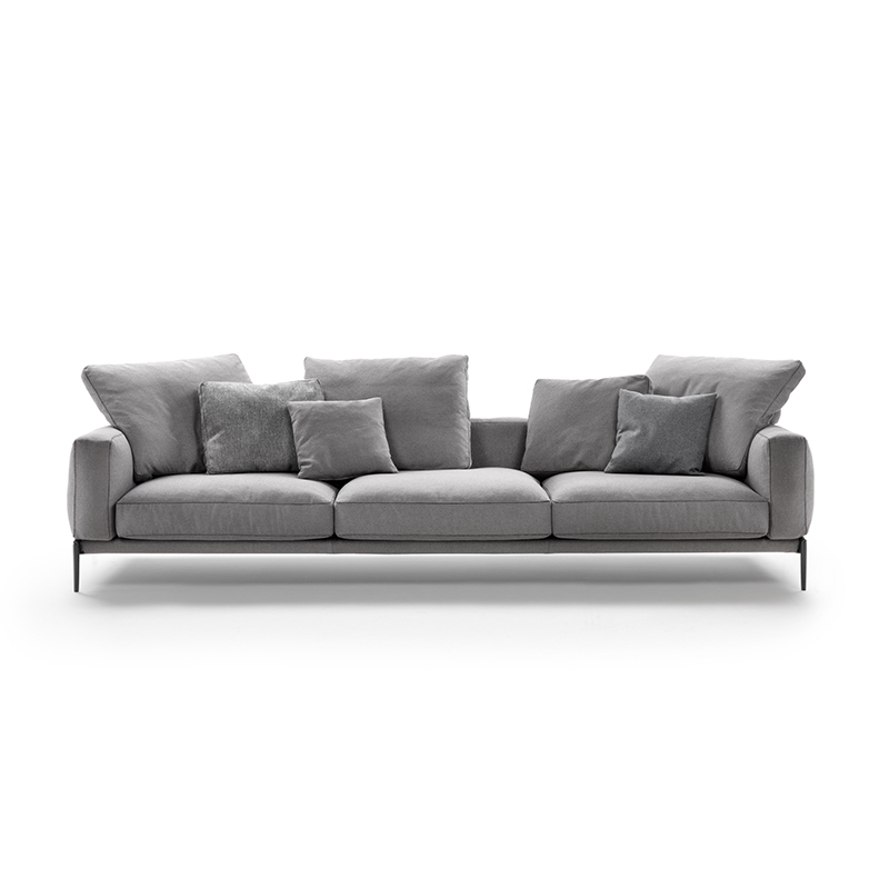 Designed by Antonio Citterio for Flexform, Romeo is a sofa that stands out for its light aesthetic line, made up of proportions and details that testify to the company's expertise in tailoring, such as the fine grosgrain piping that outlines all the seams and emphasises the harmony of the shapes. With a perfectly angled seat and cushions generously stuffed with goose feather, the Romeo sofa confirms Flexform's talent for combining understated elegance with a high level of comfort. Raised off the ground by tapered cast aluminium legs, Romeo is a seating system characterised by great versatility, allowing it to cover all the fabrics and leathers in the Flexform collection with ease, sporting different personalities. As a result, the Romeo sofa makes it possible to fit into any room, from spaces distinguished by a minimalist style to more classic environments. Contact us for more information.