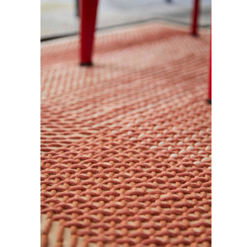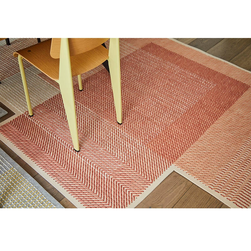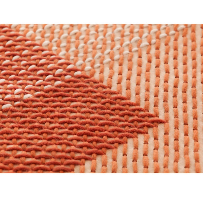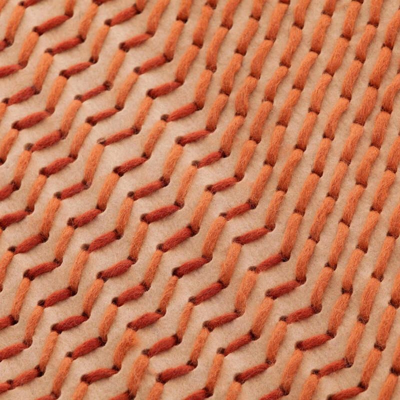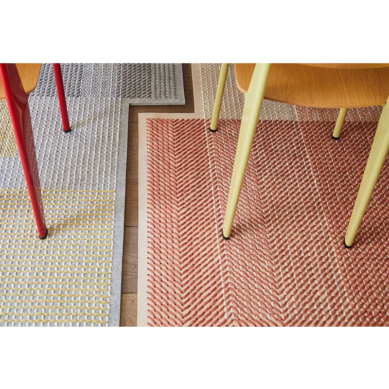 With Canevas Geo, Charlotte Lancelot uses the possibilities offered by the technique she devised for the Canevas collection in a completely different way. Using the same technique of woollen cross-stitch on a perforated felt base, Canevas Geo explores the nuances of colour and the different effects that are created when they are superimposed. Mixed with each other, the colours are reminiscent of cultivated fields seen from the sky. This composition combined with the asymmetrical shape of the Gan rug create a piece with a truly contemporary and refreshing look.