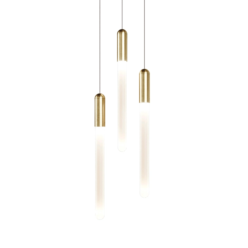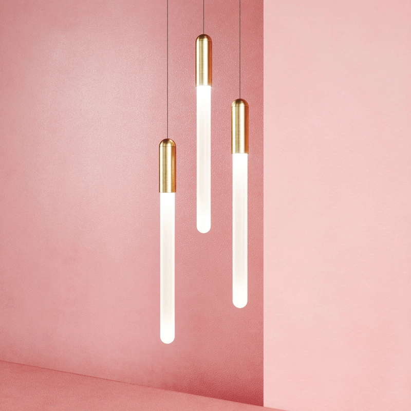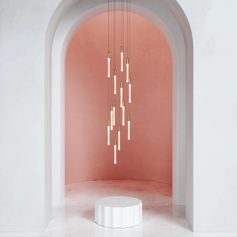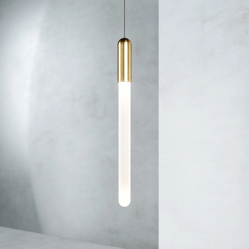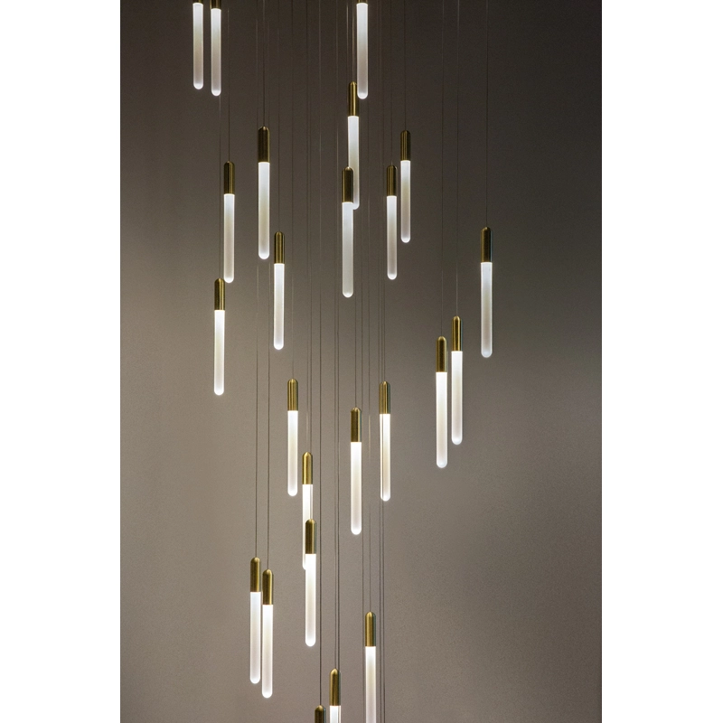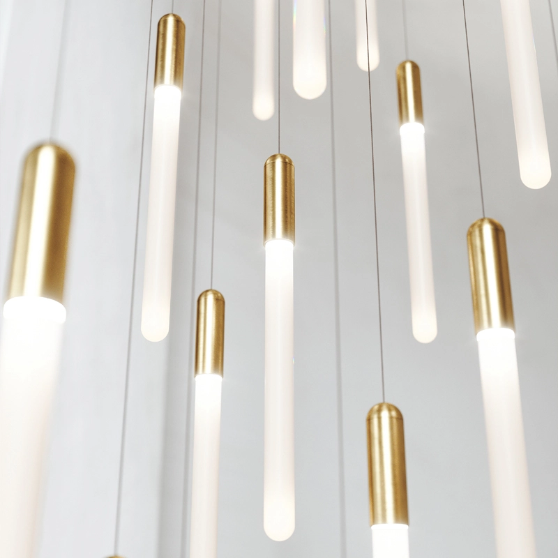 Cascadia stands out for its sleek silhouette, its pure and simple shape that conceals great technical precision. The brilliance of this pendulum light is obtained thanks to the handmade opal glass LED tube, which balances with the more industrial feel of the metal part. Available as a stand-alone version or as a composition of up to 30 suspensions,