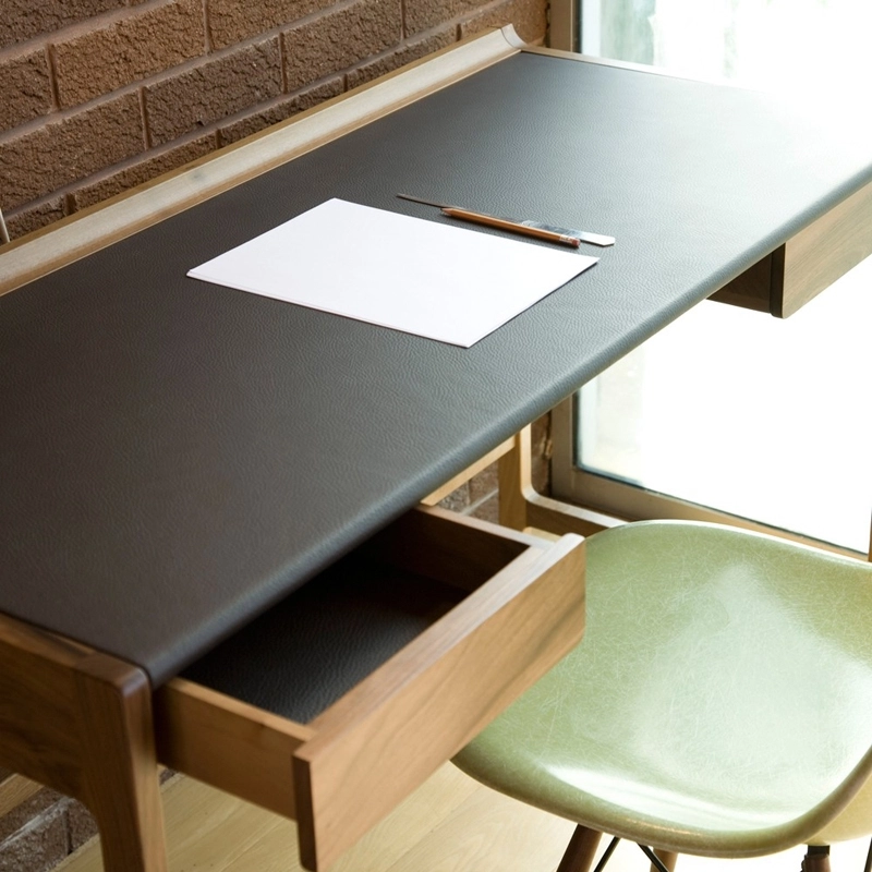 Cedric Desk is made from European walnut and sheathed in dark brown leather on the top and inside the drawers.