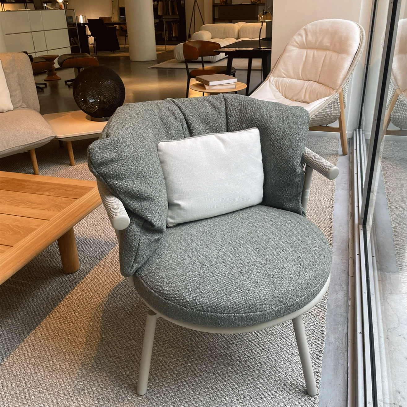 The Cesta Baxter armchair, designed by Monica Armani and offered here as a pre-owned model, reimagines traditional weaving through modern craftsmanship. Its sculptural woven backrest catches the eye with its interplay of volumes and textures, while generous cushions provide exceptional comfort. Crafted from aluminium and rope, the Cesta Baxter combines lightness, durability, and natural elegance. The 360-degree swivel base ensures smooth, fluid movement, perfect for relaxation and conversation areas. Blending artisanal heritage with modern design, this designer armchair reflects the refined and timeless aesthetic signature of Monica Armani.
