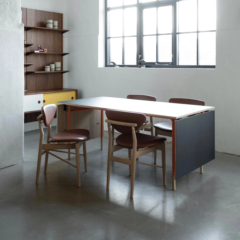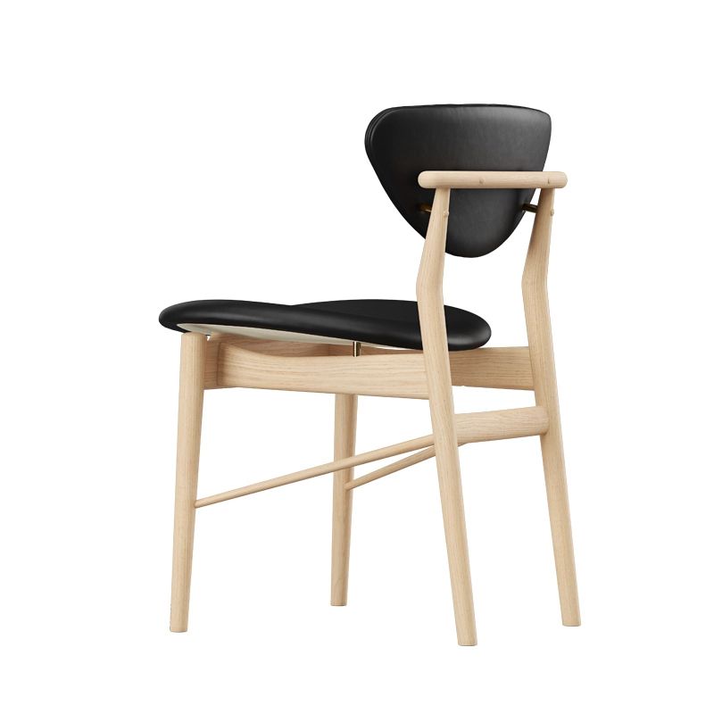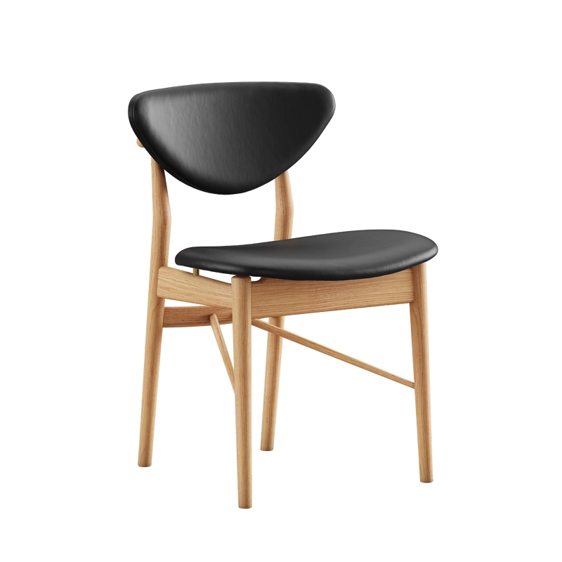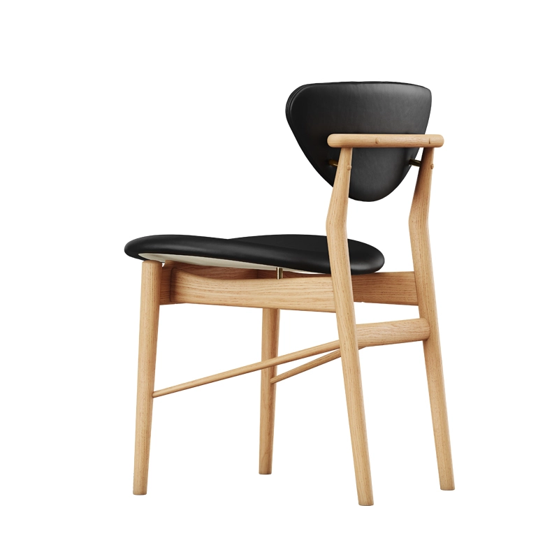 The Chair 108 was designed by Finn Juhl in 1946. On the surface, it looks like an ordinary chair. But on closer inspection, some surprising details, such as the sloping side bars, are revealed. These details bring unexpected movement and dynamism to the whole.