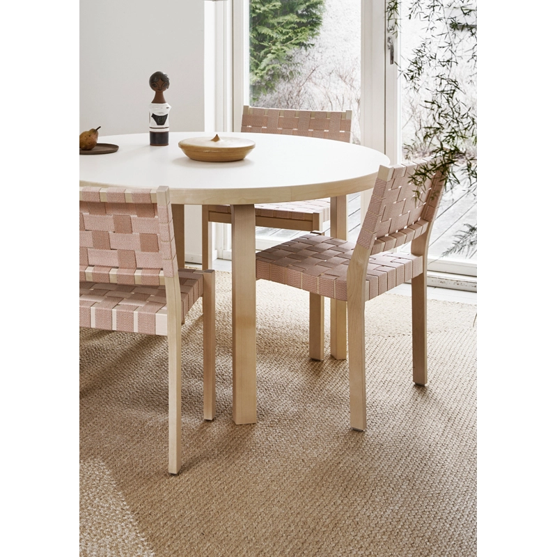 The 611 chair brings together a solid birch frame with a seat and backrest made from woven linen webbing. Designed for comfort and practicality, the strap adapts to the person sitting, making the chair exceptionally comfortable. The 611 chair can be easily reupholstered, meaning the chair can have several life cycles. One of Alvar Aalto's first modern furniture designs, the Chair 611 has been in continuous production since its inception. Adaptable to almost any environment, the chaise 611, edited by Artek, stacks up to five chairs high.