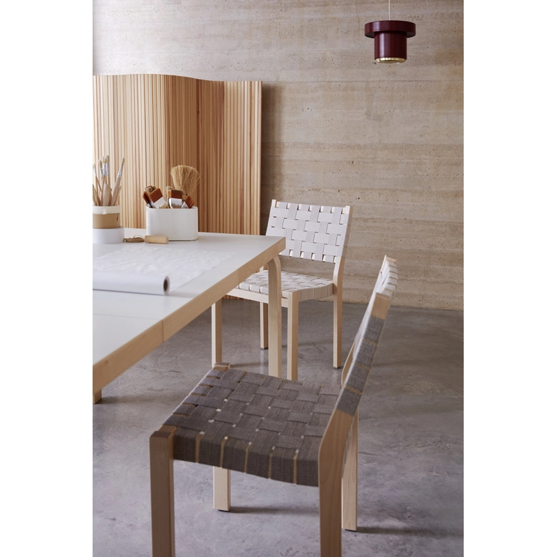 The 611 chair brings together a solid birch frame with a seat and backrest made from woven linen webbing. Designed for comfort and practicality, the strap adapts to the person sitting, making the chair exceptionally comfortable. The 611 chair can be easily reupholstered, meaning the chair can have several life cycles. One of Alvar Aalto's first modern furniture designs, the Chair 611 has been in continuous production since its inception. Adaptable to almost any environment, the chaise 611, edited by Artek, stacks up to five chairs high.