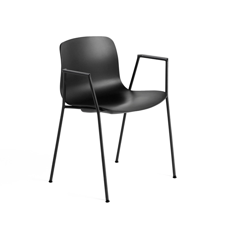 coque polypropylène recyclé (100% pp post-consommation), pieds acier finition époxy, accoudoirs mousse pu noire