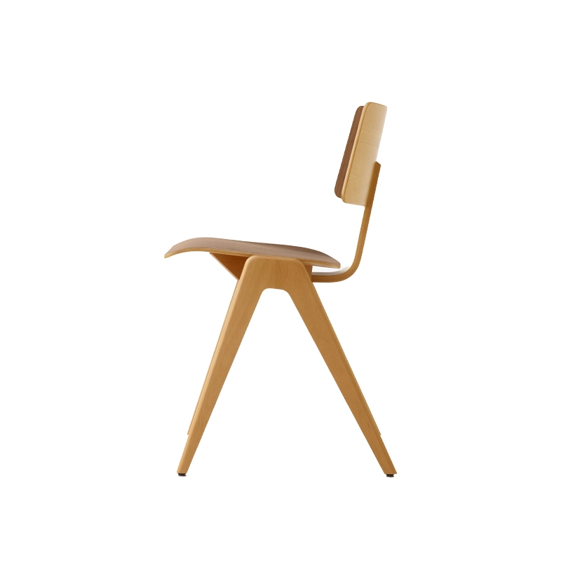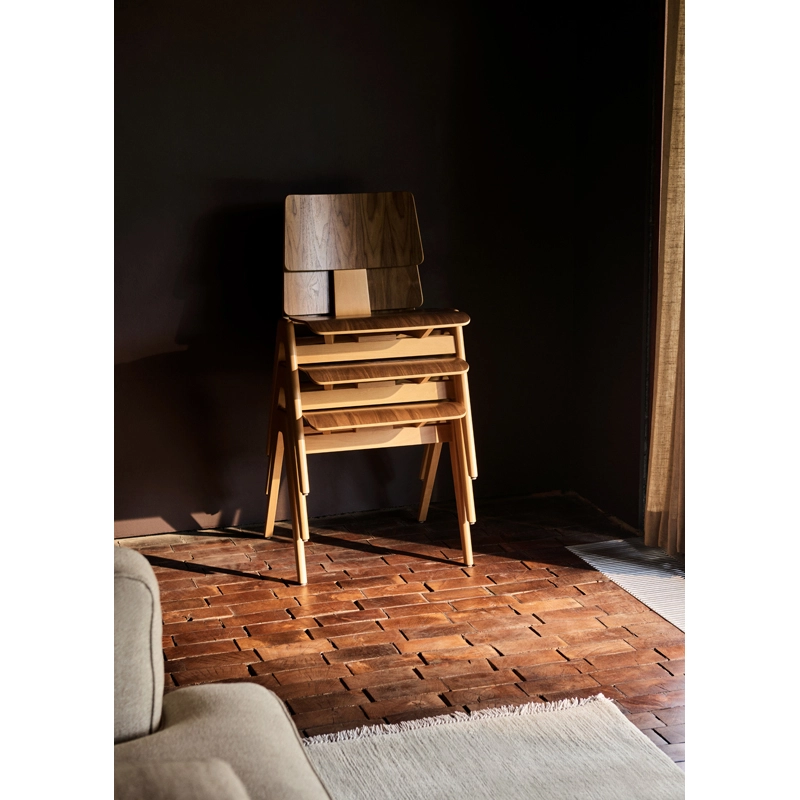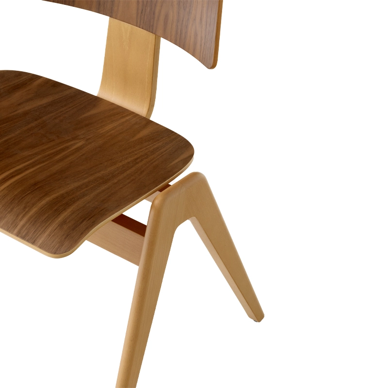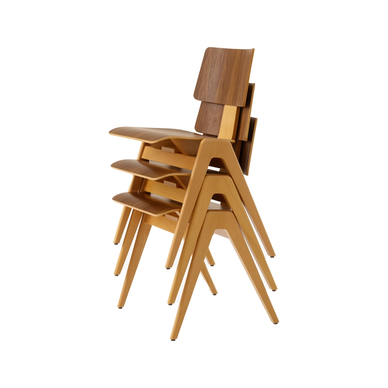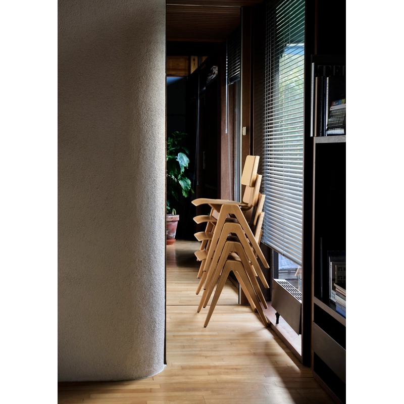 Now reissued by And Tradition, the Daystak chair is offered in two original versions: an all-beech variant and a second variant that includes a beech frame with the addition of a walnut veneer, applied to the front of the back and upper seat for a contemporary two-tone aesthetic. The legs of the chair meet in the centre of the seat to create an A shape, an aesthetic feature but also a functional one, as it allows the chairs to be stacked up to 8 high.