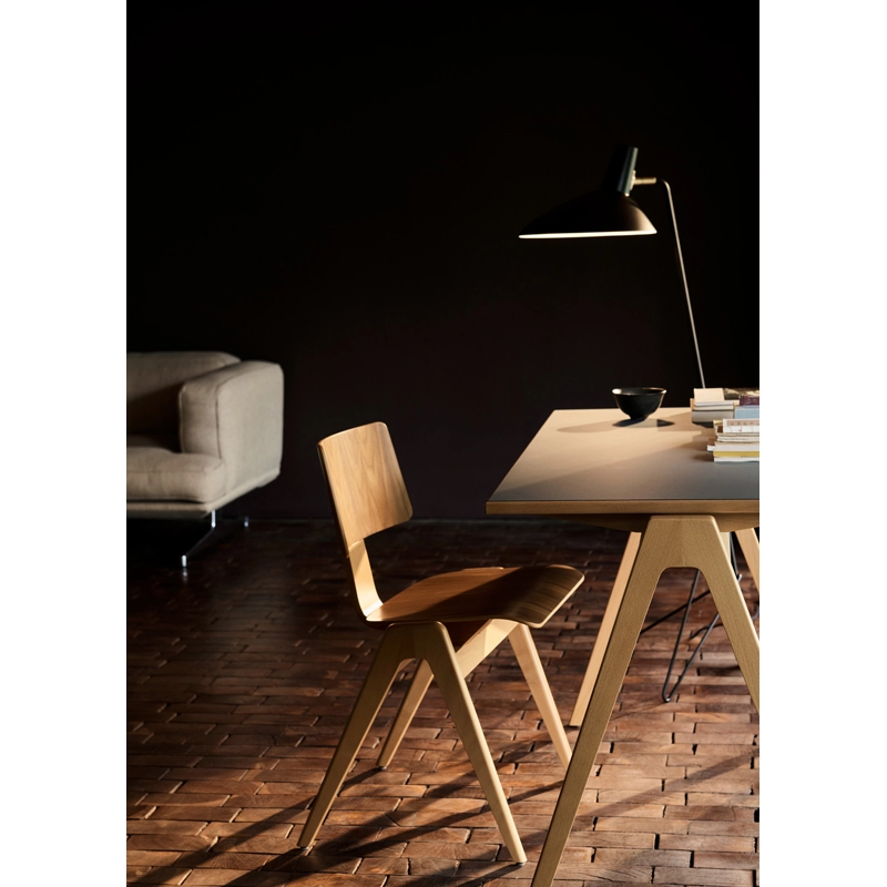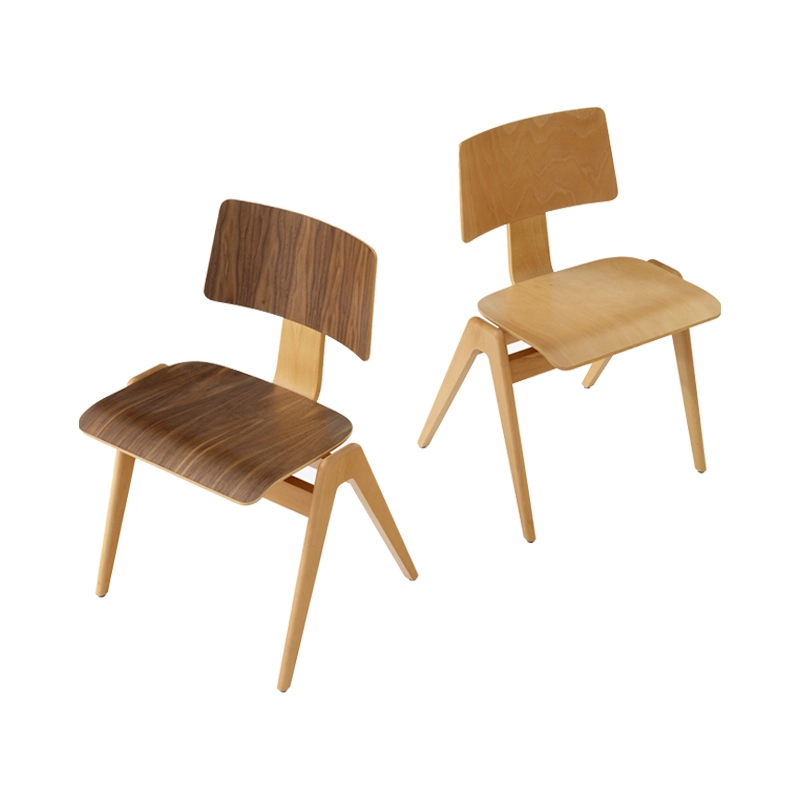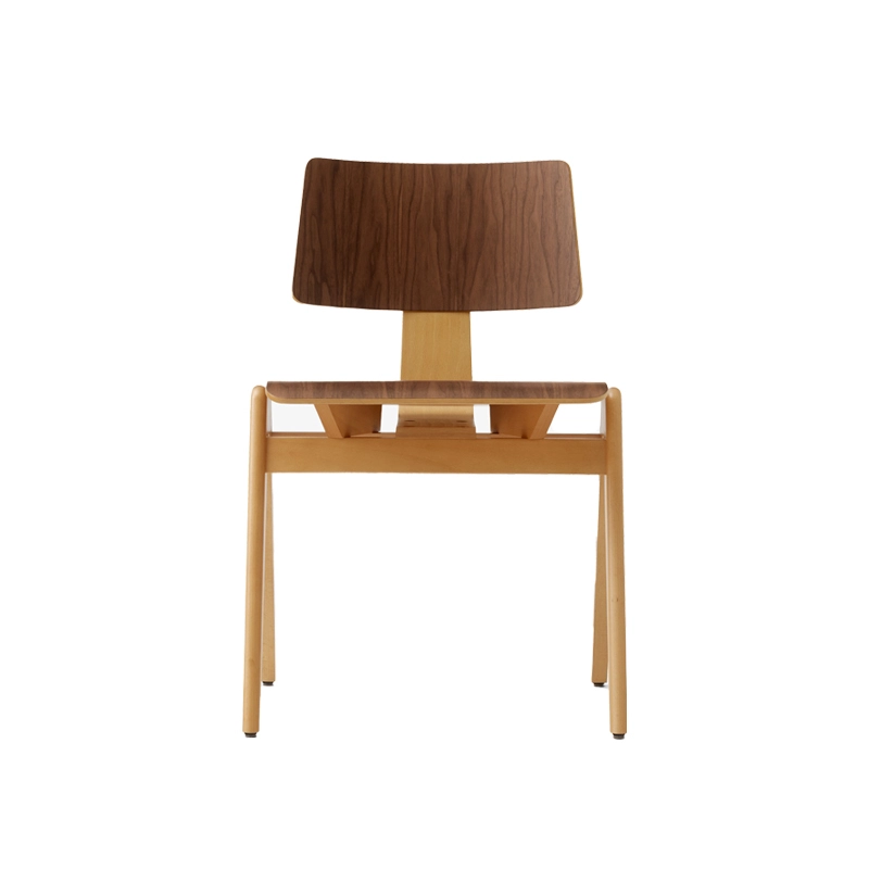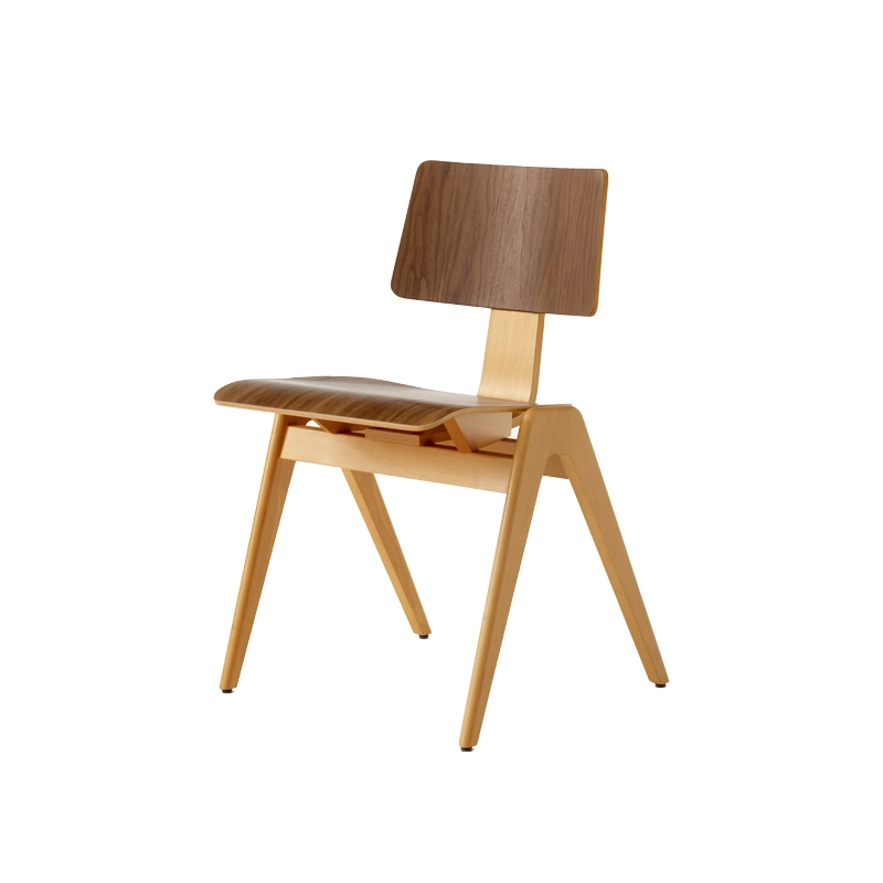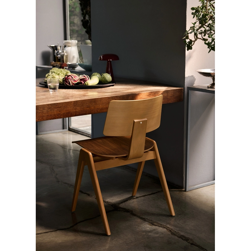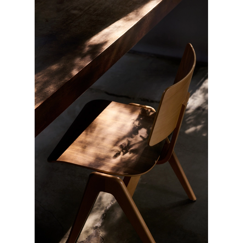 Now reissued by And Tradition, the Daystak chair is offered in two original versions: an all-beech variant and a second variant that includes a beech frame with the addition of a walnut veneer, applied to the front of the back and upper seat for a contemporary two-tone aesthetic. The legs of the chair meet in the centre of the seat to create an A shape, an aesthetic feature but also a functional one, as it allows the chairs to be stacked up to 8 high.