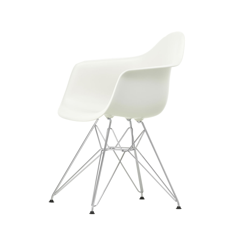 The Plastic Armchairs designed by Charles and Ray Eames in the 1950s were presented for the first time as part of the "Low Cost Furniture Design" competition organised by the Museum of Modern Art in New York. The shell with its organic lines was originally made of fibreglass. Re-issued by Vitra with a polypropylene shell, the Eames Plastic DAR (Dining Armchair Rod base) still offers great comfort at an affordable price. The base of the Eiffel Tower is made of shiny chrome plated steel rods. It's a small chair ideal for longer meals. The Eames Plastic Chair collection is now produced with a new seat height of 43cm, meeting new furniture standards.