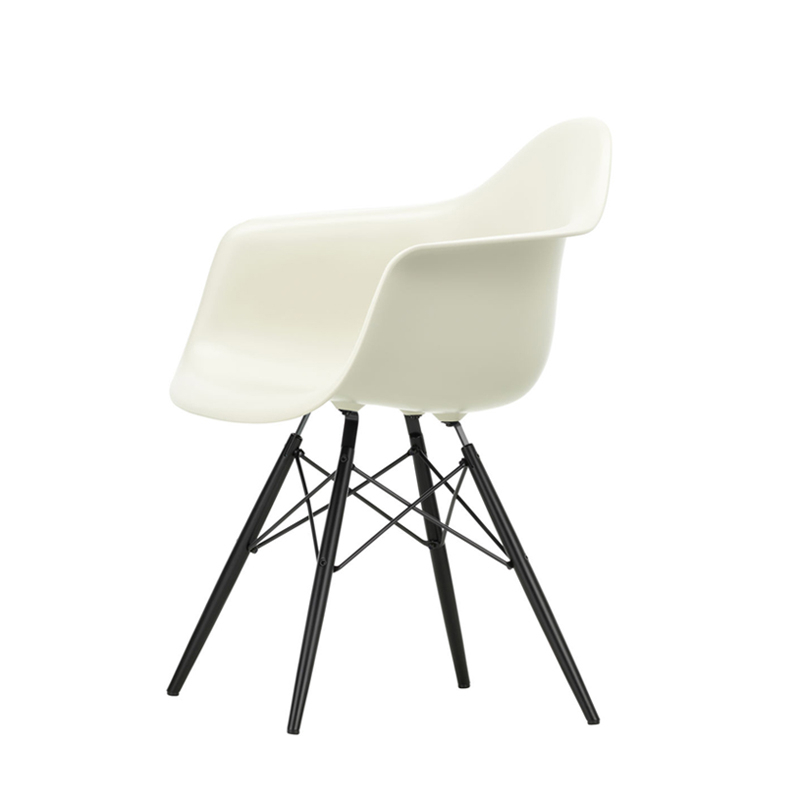 The Plastic Armchairs designed by Charles and Ray Eames in the 1950s were presented for the first time as part of the 'Low Cost Furniture Design' competition organised by the Museum of Modern Art in New York. The Eames Plastic DAW (Dining Armchair Wooden base) has an organically designed shell that was originally made of fibreglass. Re-issued by Vitra with a polypropylene shell, it continues to offer great comfort at an affordable price. The base consists of four legs in stained and lacquered maple with tubular steel crosspieces. It's a small chair that's ideal for long meals.