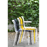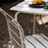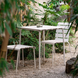 After creating several tableware objects, Dutch designer Maarten Baas designed the Aligned collection made up of outdoor chairs an armchair and a table, a collection currently published by Valerie Objects. For the designer of the collection, "the starting point was similar to every object I create: to create a fully functional piece of design that looks as if it has been sketched by hand", says Baas. So to create the Aligned collection, Baas redefined the typical outdoor furniture of metal frames and wooden slats by sketching the slats with a pencil on paper, then meticulously recreating them in real life. The result is very Maarten Baas: the design of the Aligned products looks like it was drawn by a child.