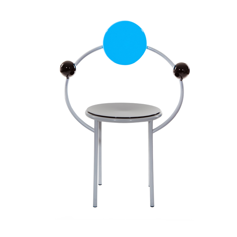 The First chair is an iconic, sculptural creation designed by Michele De Lucchi in 1983. The designer seems to be paying homage to Alexander Calder through the lightness and mobility of his shapes, his true characteristics. Produced in small series, First reinterprets the perfect combination of industry and craftsmanship, in the purest Memphis style. This chair is distinguished by its adjustable blue backrest and the two black spheres that act as armrests. TheFirst chair perfectly embodies the Memphis spirit, playing on the balance between piece of furniture and work of art. This product comes with a certificate of authenticity.
