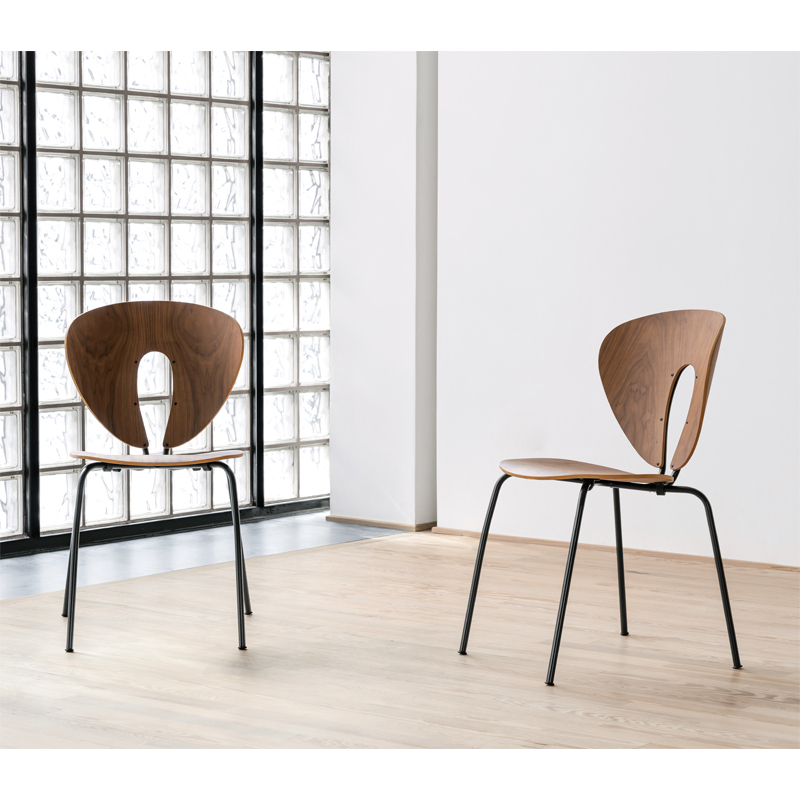 Globus chair offers particularly comfortable seating. The voluptuous shapes of the entire chair are beautifully designed and harmoniously integrated to form a perfectly finished design from every angle. The steel structure is available in chrome-plated or lacquered finishes, with smooth, well-finished curves. The seat and backrest are made of natural wood plywood, lacquered wood or polypropylene.