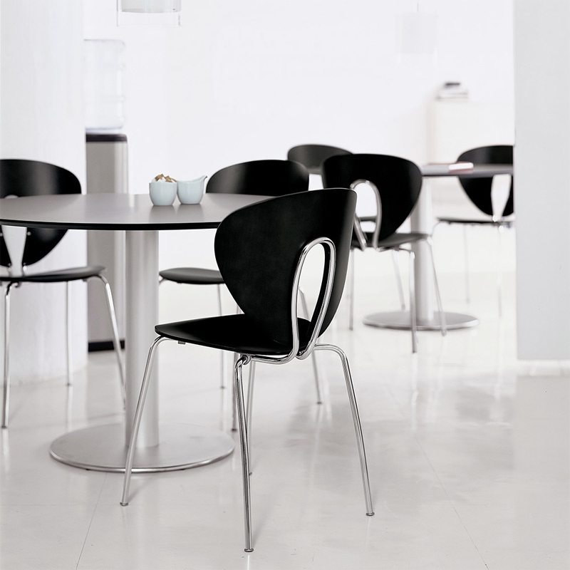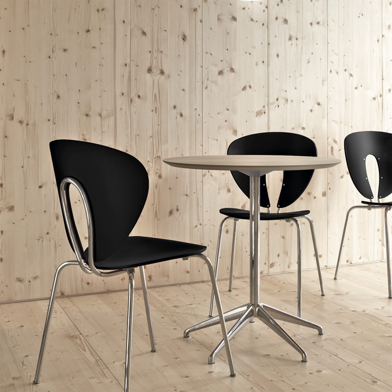 Globus chair offers particularly comfortable seating. The voluptuous shapes of the entire chair are beautifully designed and harmoniously integrated to form a perfectly finished design from every angle. The steel structure is available in chrome-plated or lacquered finishes, with smooth, well-finished curves. The seat and backrest are made of natural wood plywood, lacquered wood or polypropylene.