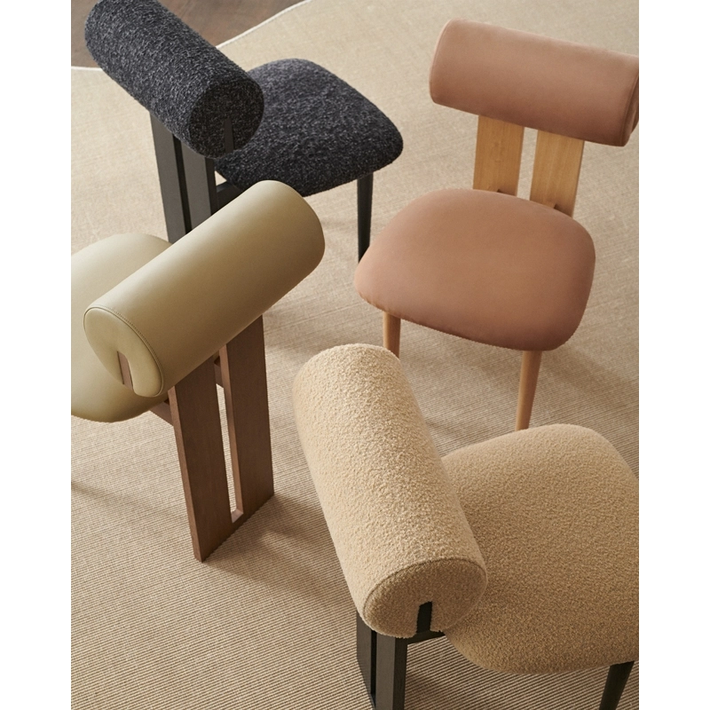 Published by NORR11, Hippo is a collection of upholstered seating featuring soft, playful shapes that make a statement in any space. The Hippo chair rests on two sturdy legs and a wooden profile linking the seat and back, which contrasts with the comfortable upholstered section. A sculptural touch in a dining room, the Hippo chair is available in a variety of high-quality wood and fabric combinations.