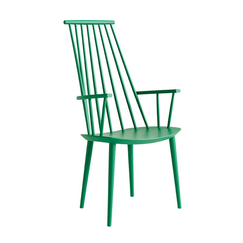 J110 chair is featured in Hay's reissued collection of Danish furniture classics originally designed for the Danish consumer cooperative society FDB. The initial idea that emerged in the 1940s was to create functional and democratic furniture, accessible to all. By using industrial production processes, and therefore reducing costs, FDB improved the availability of designer furniture for the general population, offering high quality design at relatively low prices. Designed by Poul M. Volther, the J110 armchair is made of beechwood and available in a natural or painted finish. J110 armchair perfectly represents vintage Scandinavian design with its pure, understated and retro lines. The designer opted for a backrest made of thin, wooden spindles, characteristic of the Windsor chair, to form an ethereal and graphic structure with a very comfortable seat. An armchair that adapts to all areas of your home. The seat is the same height as the other dining chairs, but thanks to its high backrest it bears a certain resemblance to a low armchair.