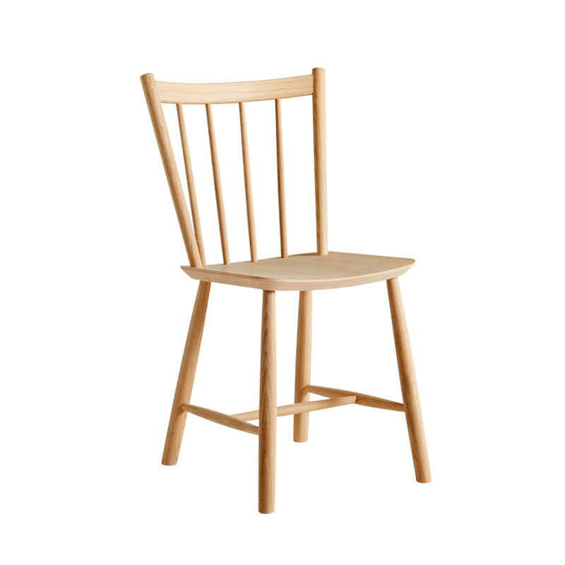 The J41 chair, designed by Børge Mogensen and reissued by Hay, features a gently sloping back and widely spaced stems creating a clean design that offers a timeless quality. The J41 chair combines natural warmth, comfort and durability. It is available in natural beech, beech lacquered in various colours, natural lacquered oak or oiled oak. The J41 Hay chair fits in with all styles of space in both the kitchen and the dining room.