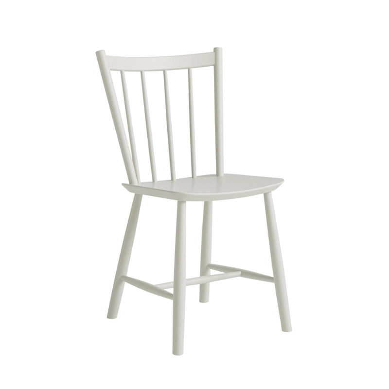 The J41 chair, designed by Børge Mogensen and reissued by Hay, features a gently sloping back and widely spaced stems creating a clean design that offers a timeless quality. The J41 chair combines natural warmth, comfort and durability. It is available in natural beech, beech lacquered in various colours, natural lacquered oak or oiled oak. The J41 Hay chair fits in with all styles of space in both the kitchen and the dining room.