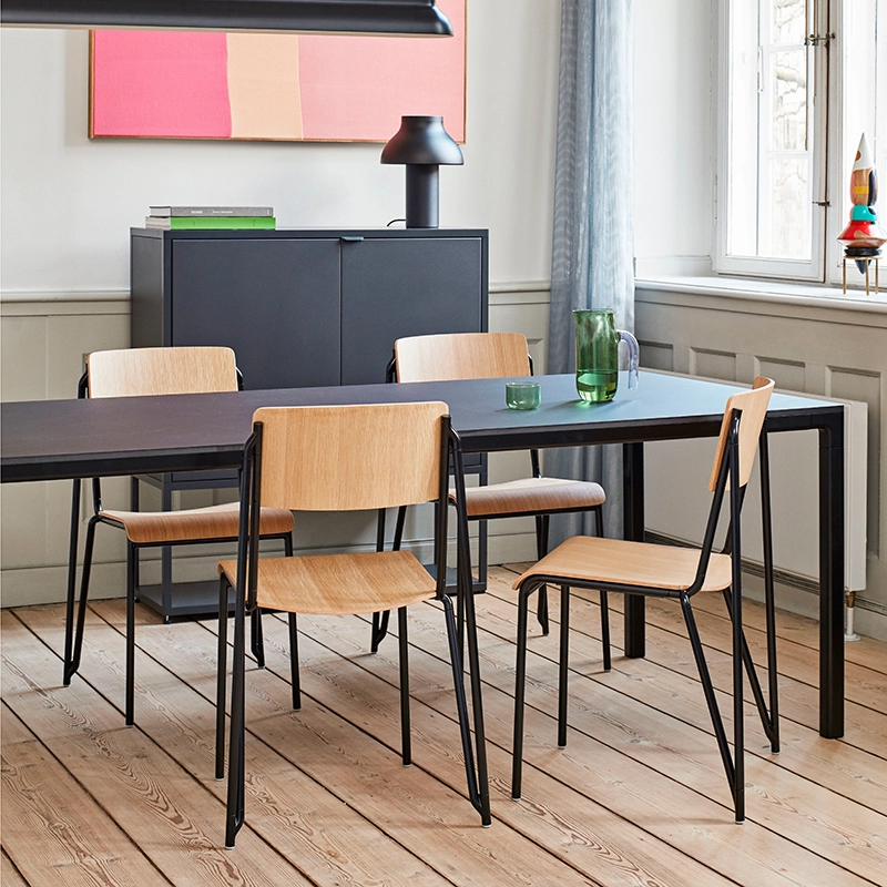The result of an eight-year journey, Daniel Rybakken's Petit Standard chair for Hay is a study in precision and thoughtful detail. With the aim of creating a highly stackable chair, where the stackable features would actually enhance the design of the chair, Petit Standard fuses elegance and functionality into an iconic design. Using cast aluminium and steel tubes that connect in a three-dimensional triangle, the lightweight frame has a distinctly geometric shape, which is balanced by the warmth and natural quality of the oak veneer seat and back. The high back and curved seat of Petit Standard provide great comfort, while the rigid tubes optimise the chair's strength and stacking capacity, making it ideal for corporate, educational and private environments.