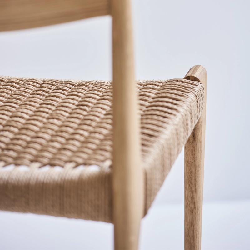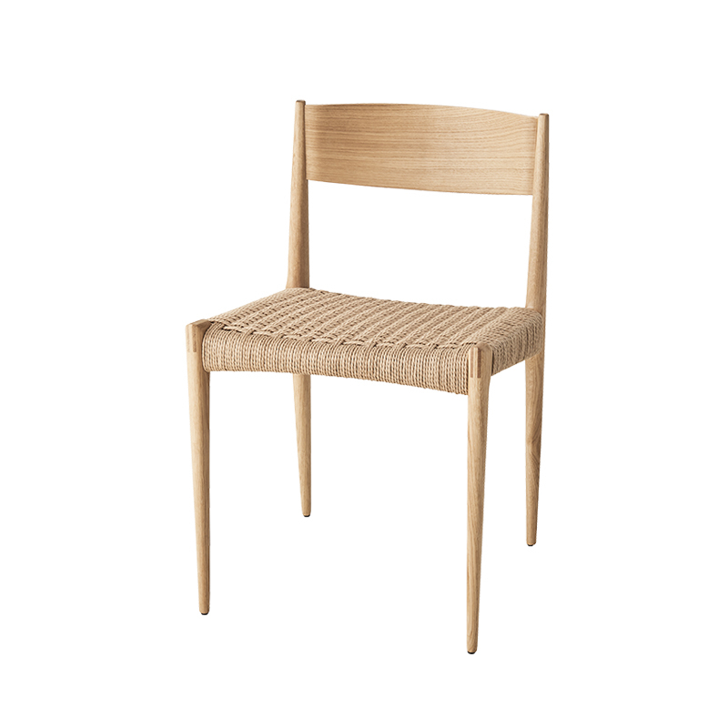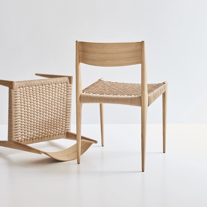 The slim, tapered solid wood legs give the Chaise Pia DK3 a light visual expression. The seat is made from hand-woven paper cord and the back is moulded for optimum seating comfort.