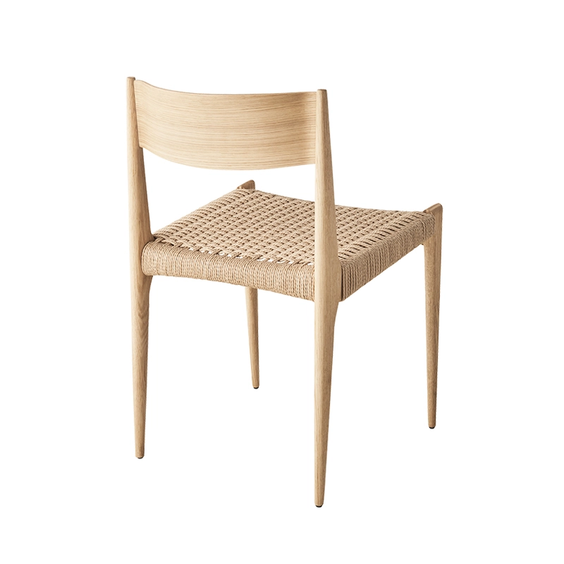 bois massif, dossier contreplaqué, assise corde de papier tissée à la main