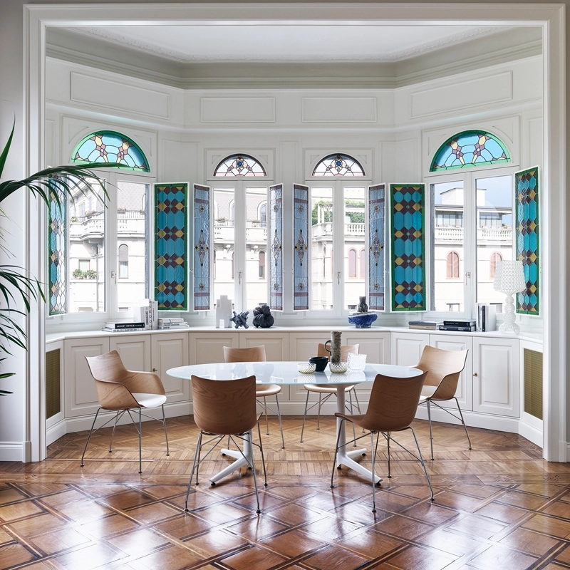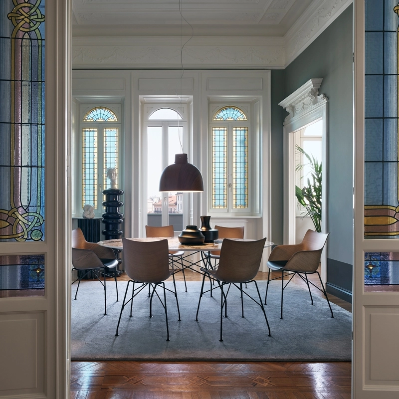 Designed by Philippe Starck for Kartell, theP/Wood chair is part of the Smart Wood furniture collection. Like the rest of the collection, the chair is characterised by its use of wood, combining timeless elegance with contemporary shapes. Using a special patented technique, the wood is actually moulded, allowing the panel to be bent as far as possible to create a seat shell with sinuous lines. The seat shell is combined with an airy, visually light steel base. Available in a range of wood and steel finishes, the Kartell P/Wood Chair is ideal for a contemporary dining room. It can be paired with the Small Q/Wood armchair and the Viscount of Wood table.