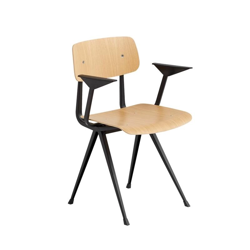 Originally created in the 1950s by Friso Kramer and Wim Rietveld while they were working at Ahrend, the Result chair is part of the collections relaunched by the latter in collaboration with the Hay brand. Considered an innovative creation, the Result chair offers an innovative use of sheet steel on a product with an organic, contemporary shape. Featuring a slim sheet steel base, Result has a seat and back made from oak, giving it maximum strength while retaining lightness. Available in different wood finishes and base colours, the Result chair from Hay is characterised by its simple construction and use of durable, solid materials.The result is a versatile chair that adapts easily within many public and private spaces.