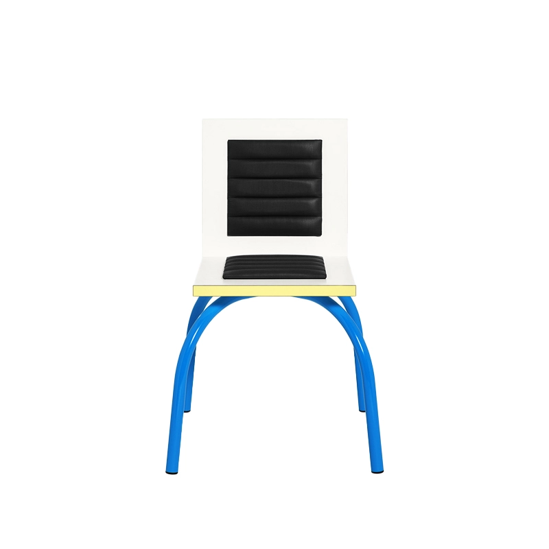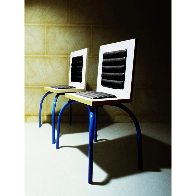 The Rivera chair, designed by Michele De Lucchi, is probably the closest object to the avant-garde appliance prototypes he created in 1979 for the Girmi company. It represents an attempt to emphasise a playful and not just functional relationship with everyday useful objects. Riviera is a chair that surprises us with its playful shape: its base is made up of two intersecting blue arches, while the seat is folded like a book. The Rivera Memphis chair is made from decorative laminate with a fabric cover and painted metal legs. This product comes with a certificate of authenticity.