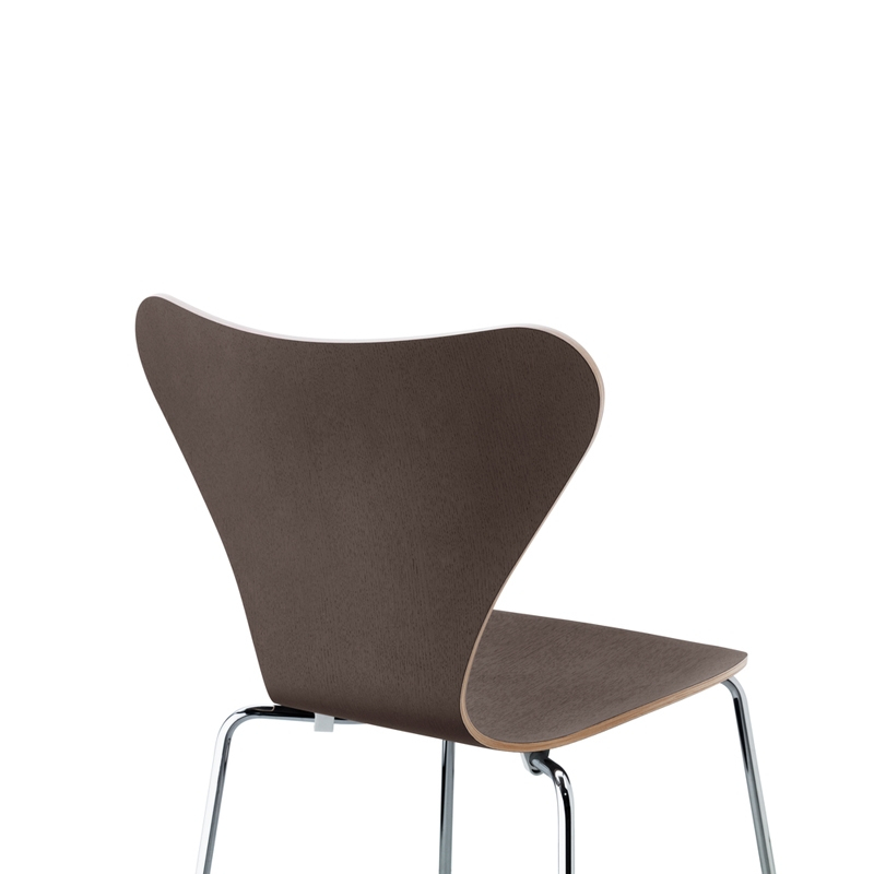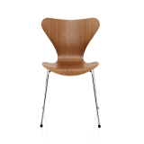The Series 7 chairs, designed by Arne Jacobsen in 1955, are by far the best-selling chairs in the history of the manufacturer Fritz Hansen. Classics of design, they are part of our daily lives.A visionary, Arne Jacobsen exploited the possibilities of veneer and wood moulding already, used on the Ant Chair in 1952, to achieve the iconic shape of Series 7. Lightweight and stackable, its soft and comfortable shape make it a prized addition in any space. The chrome frame is combined with a walnut, oak, dark oak, or stained ash seat. Series 7 is also available in a children's version.