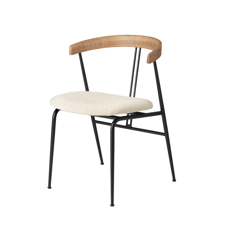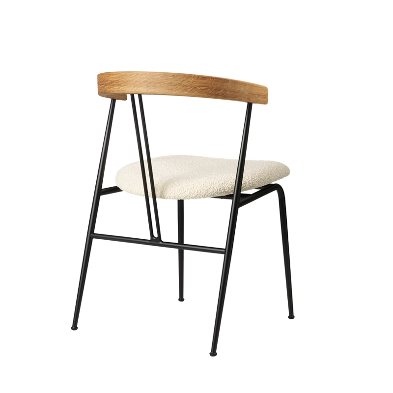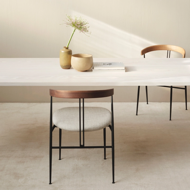 Designed by the GamFratesi duo for the Gubi brand, Violin is a collection of elegant, lightweight and contemporary chairs that perfectly illustrates the design duo's expertise, creativity and understanding of materials. The name refers to the two parallel lines that run from the backrest to a horizontal bar beneath the seat, evoking the strings of a violin, or even a tuning fork. The musicality of the name resonates with a chair that evokes a musical instrument in its geometry, symmetry and craftsmanship. Other details, such as the soft lines on either side of these parallel bars, imbue the chair with a distinctive expression. Refined details give the Chaise Violin its aesthetic signature as well as functional support for the backrest. The tapered frame supports a generous, rounded seat and a wrap-around backrest that extends to support arms, elbows or hands. The shape of the backrest makes it easy to move around and is still very comfortable, even after a long dinner. Available with an upholstered seat combined with a wooden backrest, or in a more voluminous version where both the seat and backrest are upholstered, the chaise Violin has a clear silhouette and a strong identity, finding its place in both contemporary interiors and communal spaces. With its low weight, the Chaise Violin is easy to move and its open structure gives it an airy feel.
