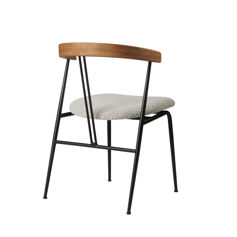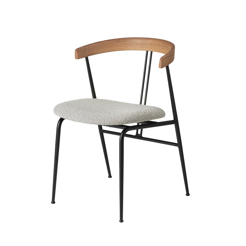 Designed by the GamFratesi duo for the Gubi brand, Violin is a collection of elegant, lightweight and contemporary chairs that perfectly illustrates the design duo's expertise, creativity and understanding of materials. The name refers to the two parallel lines that run from the backrest to a horizontal bar beneath the seat, evoking the strings of a violin, or even a tuning fork. The musicality of the name resonates with a chair that evokes a musical instrument in its geometry, symmetry and craftsmanship. Other details, such as the soft lines on either side of these parallel bars, imbue the chair with a distinctive expression. Refined details give the Chaise Violin its aesthetic signature as well as functional support for the backrest. The tapered frame supports a generous, rounded seat and a wrap-around backrest that extends to support arms, elbows or hands. The shape of the backrest makes it easy to move around and is still very comfortable, even after a long dinner. Available with an upholstered seat combined with a wooden backrest, or in a more voluminous version where both the seat and backrest are upholstered, the chaise Violin has a clear silhouette and a strong identity, finding its place in both contemporary interiors and communal spaces. With its low weight, the Chaise Violin is easy to move and its open structure gives it an airy feel.
