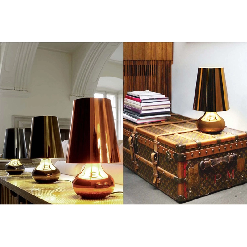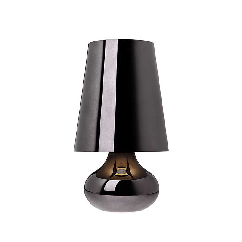 Cindy is a typical 70s table lamp whose shape and colour have been modernised by the designer Ferruccio Laviani. Produced by Kartell, it features a conical shade and a drop-shaped spherical base, and is available in a wide range of metallic opaque tones: platinum, dark gold, fuchsia, rifle barrel, and more. The entire body is made of ABS. Cindy's uniqueness is its glossy finish: chrome plating gives rise to stunning ever-changing reflections creating a unique touch of luxury and modernity.