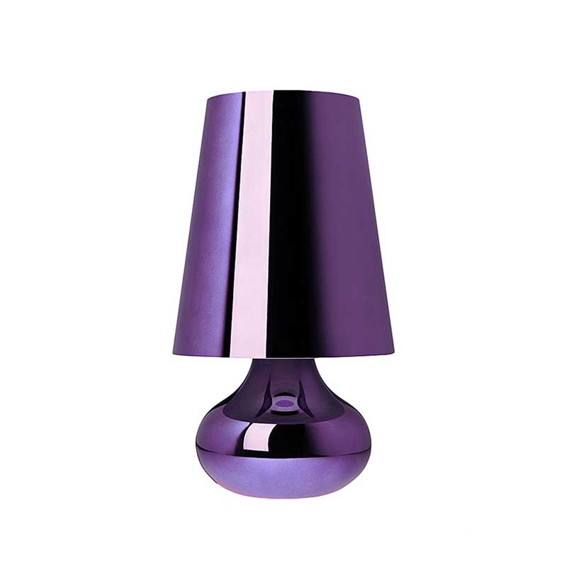 Cindy is a typical 70s table lamp whose shape and colour have been modernised by the designer Ferruccio Laviani. Produced by Kartell, it features a conical shade and a drop-shaped spherical base, and is available in a wide range of metallic opaque tones: platinum, dark gold, fuchsia, rifle barrel, and more. The entire body is made of ABS. Cindy's uniqueness is its glossy finish: chrome plating gives rise to stunning ever-changing reflections creating a unique touch of luxury and modernity.
