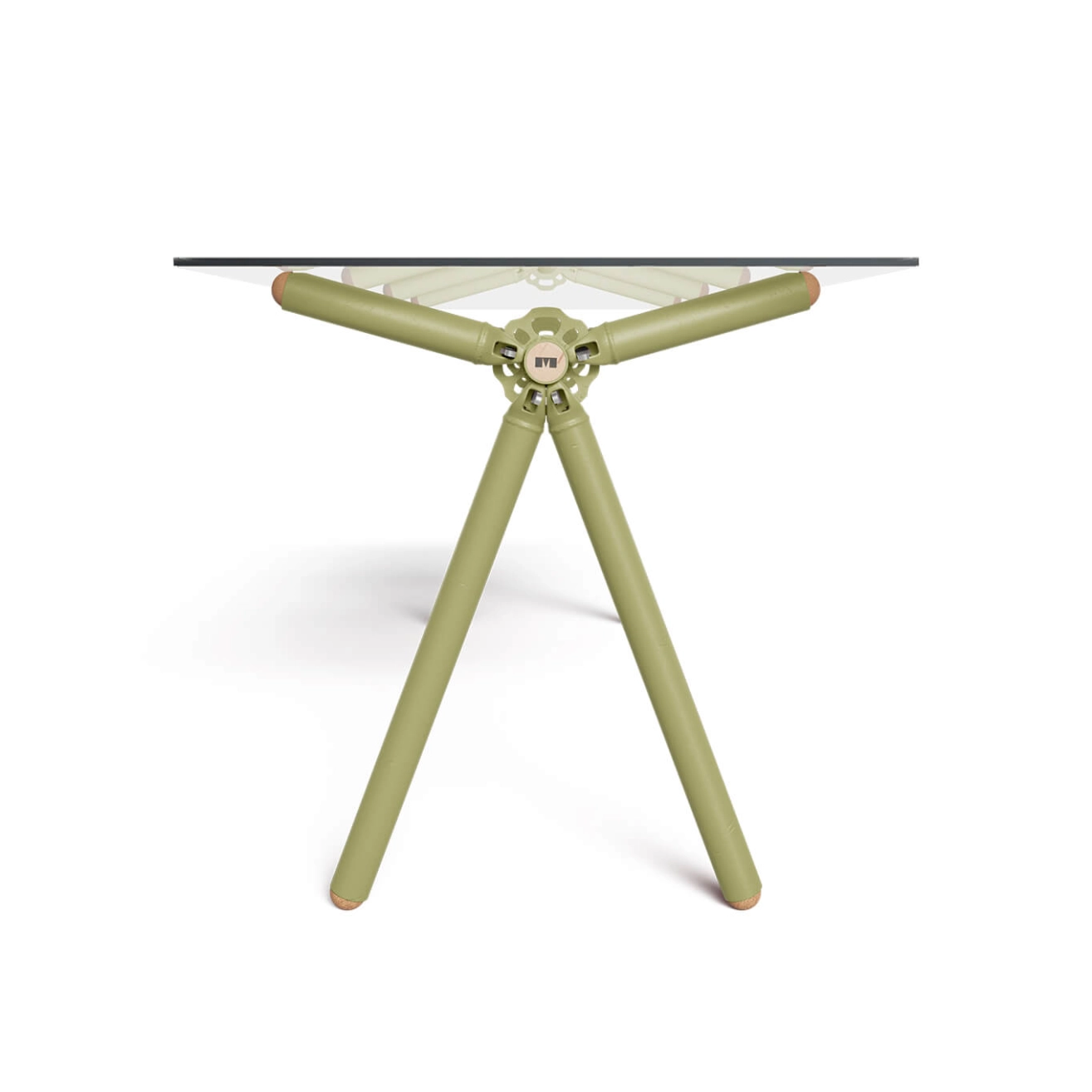 A custom-made project is the only solution to save the Altrad-Plettac scaffolding fleet from a compromised future… and this is where the Clavex table available in 3 sizes (for 6, 8, or 10 people) comes into play. After years of rental, these scaffolds are no longer suitable for supporting a worker at height, but they retain all their structural qualities when used on the ground. It is with this in mind that Maximum sees an opportunity to create a unique piece. A glass partition is cut to fit the space perfectly. This glass is hardened for safety reasons, making it impossible to cut again. When removed, these glass panels, even in perfect condition, inevitably end up at the recycling center. Due to their fixed dimensions, their reuse becomes a challenge. The epoxy paint used is a powder sprayed onto the steel parts before being baked at 200°C. During this process, part of the powder also spreads onto the glass panels. Once the application is complete, part of this powder is sucked into the recovery circuits, where it mixes with the residues in the tanks. The resulting mixture is fully reusable, although each color obtained is unique and unpredictable.