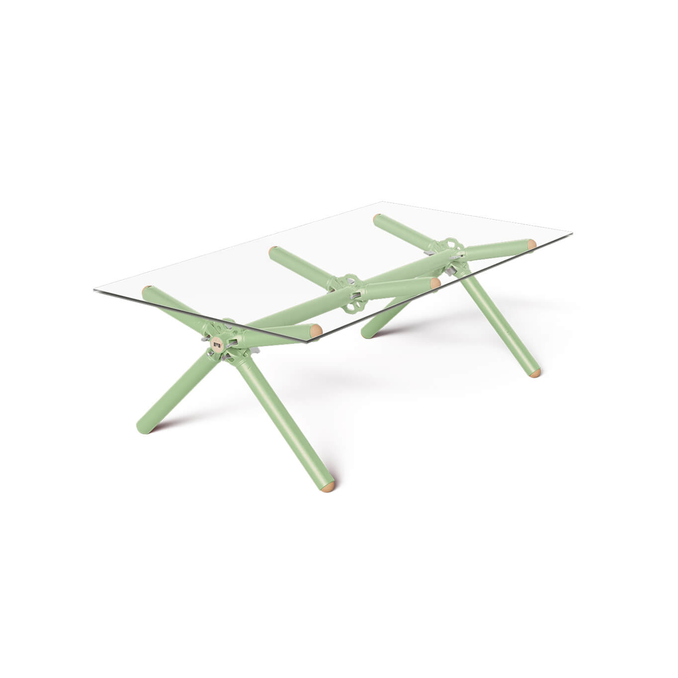 A custom-made project is the only solution to save the Altrad-Plettac scaffolding fleet from a compromised future… and this is where the coffee table Clavex available in 2 sizes (for 6 or 8 people) comes into play. After years of rental, these scaffolds are no longer suitable for supporting a worker at height, but they retain all their structural qualities when used on the ground. It is with this in mind that Maximum sees an opportunity to create a unique piece. A glass partition is cut to fit the space perfectly. This glass is hardened for safety reasons, making it impossible to cut again. When removed, these glass panels, even in perfect condition, inevitably end up at the recycling center. Due to their fixed dimensions, their reuse becomes a challenge. The epoxy paint used is a powder sprayed onto the steel parts before being baked at 200°C. During this process, part of the powder also spreads onto the glass panels. Once the application is complete, part of this powder is sucked into the recovery circuits, where it mixes with the residues in the tanks. The resulting mixture is fully reusable, although each color obtained is unique and unpredictable.