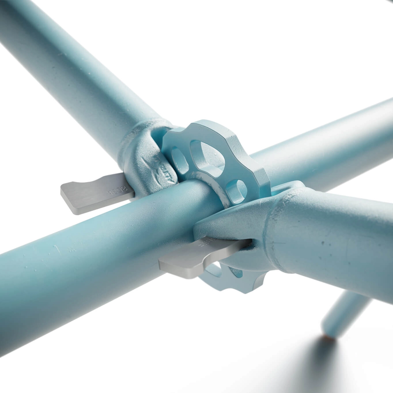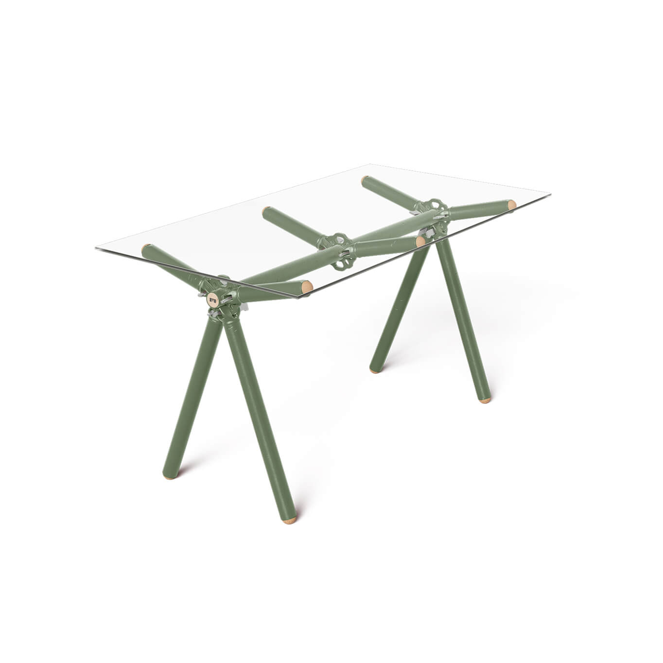 A custom-made project is the only solution to save the Altrad-Plettac scaffolding fleet from a compromised future… and this is where the Clavex table available in 3 sizes (for 6, 8, or 10 people) comes into play. After years of rental, these scaffolds are no longer suitable for supporting a worker at height, but they retain all their structural qualities when used on the ground. It is with this in mind that Maximum sees an opportunity to create a unique piece. A glass partition is cut to fit the space perfectly. This glass is hardened for safety reasons, making it impossible to cut again. When removed, these glass panels, even in perfect condition, inevitably end up at the recycling center. Due to their fixed dimensions, their reuse becomes a challenge. The epoxy paint used is a powder sprayed onto the steel parts before being baked at 200°C. During this process, part of the powder also spreads onto the glass panels. Once the application is complete, part of this powder is sucked into the recovery circuits, where it mixes with the residues in the tanks. The resulting mixture is fully reusable, although each color obtained is unique and unpredictable.